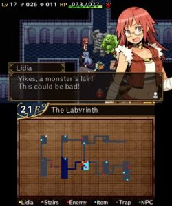 Pour ceux qui se sont essayés à Adventure Bar Story, vous ne serez pas complètement perdus, car, entre autres similarités, vous aurez le plaisir de retrouver toute la petite troupe de Siela & Cie. Toutefois, celle-ci n’est plus notre héroïne, mais seulement un des personnages secondaires de l’histoire. C’est désormais Lidia que nous incarnons, une jeune aventurière pleine d’entrain et qui souhaite partir à la conquête du mystérieux Labyrinthe qui est apparu aux limites de la ville. Elle est au début du jeu accompagnée de ses amis qui, contrairement à ce que l’on pourrait penser, ne nous accompagneront pas dans notre exploration, qui sera plutôt une longue quête solitaire.