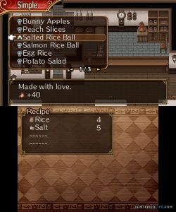 Concernant les objets que vous pouvez ramasser, nous pouvons les diviser en trois catégories. Vous trouverez tout d’abord des objets vous servant à vous équiper : épées, boucliers, anneaux, amulettes, bâtons. Ces équipements, une fois ramassés, restent en votre possession même si vous êtes vaincus lors de votre exploration, ils peuvent être améliorés grâce à d’autres objets, et les caractéristiques qu’ils acquièrent restent. Les objets d’équipement ont des caractéristiques bien particulières qu’il vous faudra étudier de près, notamment en fonction des ennemis que vous affrontez. Les bâtons par exemple demandent une attention toute particulière car leur fonction est inconnue jusqu’à ce que vous les utilisiez ou que vous les « identifiez » (nous en parlerons plus tard), et ils n’ont qu’un nombre d’utilisations limité. Mais pas de panique, tout cela vous est expliqué en jeu. Viennent ensuite les articles servant à vous booster et rendre l’exploration un peu plus aisée : potions (soin, poison agissant sur les ennemis,…), livres (permettant de gagner en puissance, d’identifier les objets inconnus tels que les bâtons…), nourriture préparée (« boxed lunch », pain, petits plats…). Et nous abordons là l’un des points essentiels du jeu. La nourriture. La troisième catégorie d’objets que vous pourrez ramasser dans le donjon n’apparaîtra pas immédiatement dans votre inventaire, il s’agit des ingrédients : chou, pâte à tarte, poulet, j’en passe et des meilleurs… Ceux-ci vous serviront à confectionner de délicieux petits plats qui vous permettront… Eh bien, tout simplement de rester en vie ! Car, comme si se trouver enfermés dans un donjon avec des bestioles à nos trousses ne suffisait pas, notre estomac aussi nous veut du mal, avec un système « réaliste » amenant Lidia à se plaindre à grands cris dès que son ventre est vide pour nous avertir que l’échec n’est pas loin si nous ne la nourrissons pas. Deux jauges à garder à l’œil donc : les points de vie, et les points « estomac », car les uns comme les autres vous garantissent une éjection du donjon s’ils tombent à zéro !