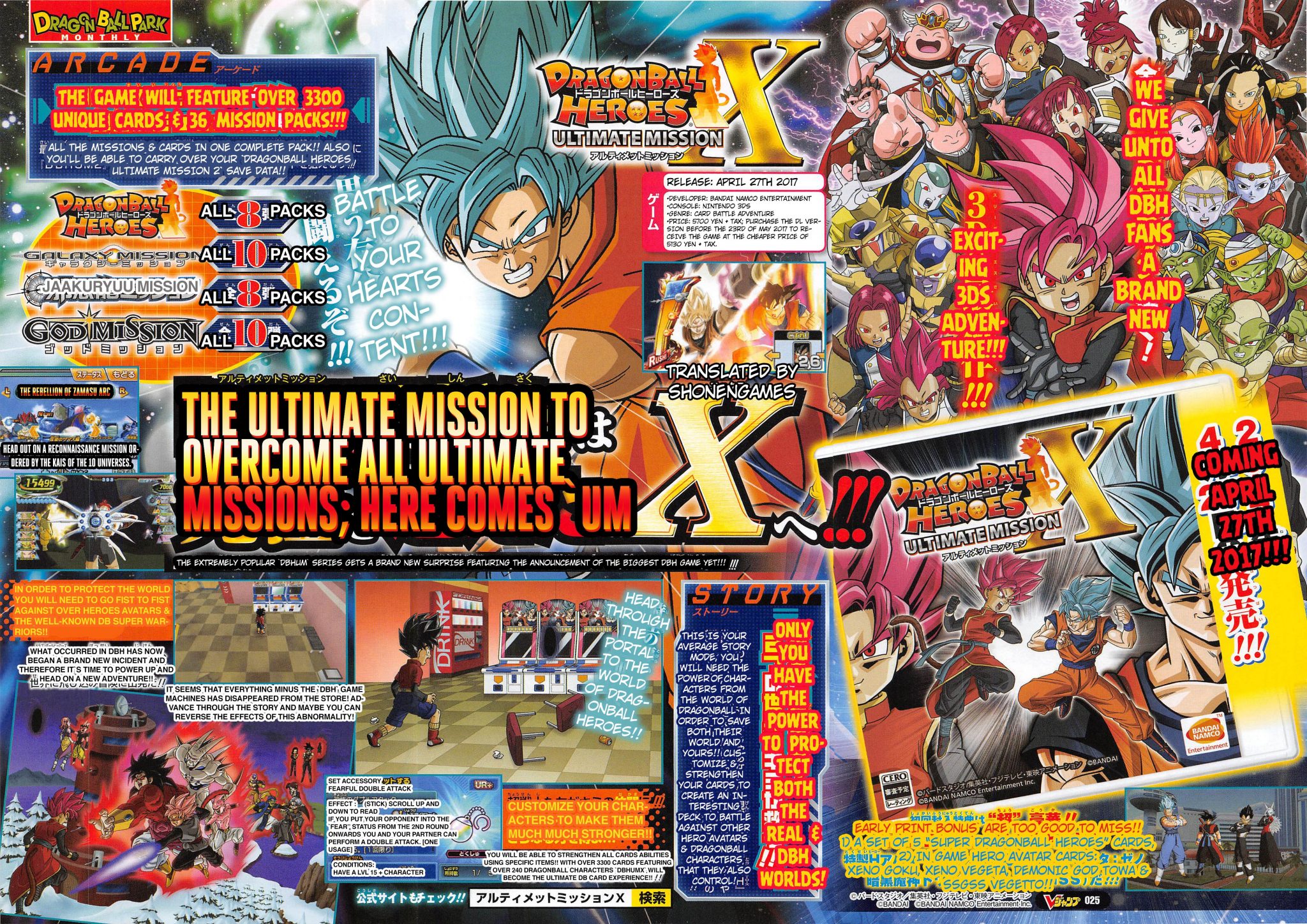 Alors que Dragon Ball Fusion arrive le 17 février prochain sur Nintendo 3DS en Europe, le magazine japonais V-Jump révèle un nouveau titre. Dragon Ball Heroes : Ultimate Mission X est annoncé exclusivement sur 3DS pour le 27 avril au Japon. Le jeu disposera de 3300 cartes uniques et 36 « mission packs ». Cette fois-ci, vos items vous permettront de booster vos cartes.  Les premiers bonus du jeu seront des cartes physiques et des cartes dans le jeu pour les heroes, des personnages jouables (Gokû Xeno, Xeno Vegeta, Dieu Démon Towa et Vegetto SSB / SSGSS).