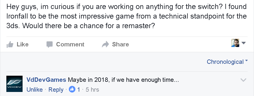 De plus, il est sorti gratuitement sur l’eShop avec des achats en kit pour avoir le mode histoire, le mode multi, ou les deux. Une communication un peu confuse qui a surement nui à sa popularité. VD-dev, le studio Franco-canadien, travail aujourd’hui sur RISE: Race The Future (une news arrive à son sujet dans la journée). Mais le sut ido a répondu il y a peu à une interrogation : Ironfall peut il arriver aussi sur Nintendo Switch ?