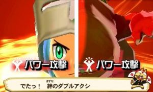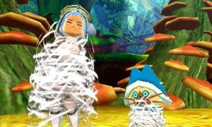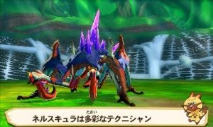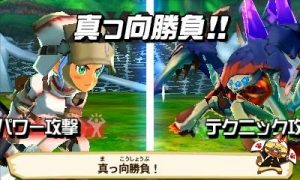 Difficile de voir où se situe le bouleversement des mécaniques de gameplay avec la dernière longue tirade sur l’exploration que l’on vient de faire n’est-ce pas ? On ne relève de différent que le fait de chevaucher des monstres ou de chercher des nids de monstres. Toutefois, on vous assure que le titre bouleverse le gameplay de la série. Après tout, on passe de quelque chose de proche du A-RPG à un JRPG classique. Et ce changement nous amène à un système de combat qui n’est désormais plus en temps réel. On ne passe plus des dizaines de minutes à taper et poursuivre un gros monstre à travers différente zone de la carte. La carte du monde est toujours remplie de monstres comme auparavant dans la série mais en entrant en contact avec eux, c’est après une courte transition que l’on atterrit sur une scène de combat similaire à d’autre RPG au tour par tour. L’action se déroule sur l’écran supérieur et les commandes sont sur l’écran tactile. On peut directement saisir ses commandes via tactile ou en sélectionnant avec les touches.  Les combats sont au tour par tour dynamique dont les attaques standards sont régit par un système de « pierre-feuille-ciseau ». En choisissant d’attaquer, vous aurez la possibilité de lancer une attaque de type : Puissance, Technique ou Vitesse. La Puissance bat la Technique, la Technique bat la Vitesse et vous devinez déjà la fin de la boucle. Cela dit, même si vous avez l’avantage du type d’attaque, chaque attaque infligera des dégâts, vous aurez simplement un certain avantage et bonus de dégâts à sélectionner le bon type d’attaque. Le fait est qu’en lançant votre action, tout ne se déroule pas exactement au tour par tour. Il peut y avoir des cas où l’ennemi attaque en même temps que vous et c’est le type d’attaque qui déterminera l’avantage de dégâts. Notez que dans ce genre de duel, tant que vous avez l’avantage vous ne pourrez pas mourir. C’est-à-dire que si durant ce genre de duel, vous utilisez une attaque de type Vitesse contre un ennemi qui vous visait avec une attaque de type Puissance, si celui-ci aurait dû vous tuer en termes de dégâts, l’avantage que vous avez eu en sélectionnant le bon type d’attaque vous préservera à 1 PV. A vous de décider si vous prenez le risque de poursuivre dans cet état ou de jouer de manière plus sure. Pas d’inquiétude, vous n’êtes pas seul en combat, on ne fait pas que collectionner des monstres, on combat avec eux ! Ainsi, le monstre que vous avez défini comme principal dans votre groupe prend également part au combat. Une des commandes de combat vous permet également de changer ce monstre sans perdre un tour parmi ceux constituant votre groupe de mission. Vous ne pouvez en revanche changer de monstre qu’une seule fois par tour.