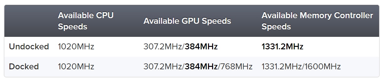 Mais la grande information de ces fuites concerne l’horloge GPU de la console : d’après Eurogamer les développeurs ont plusieurs choix concernant la vitesse du GPU, pour le mode portable ils peuvent choisir entre la vitesse par défaut 307.2MHz et une vitesse boosté 384MHz ce qui équivaut à 25% de puissance de calcul supplémentaire. Mais ils peuvent aussi choisir d’utiliser une vitesse de GPU du mode portable pour le dock.