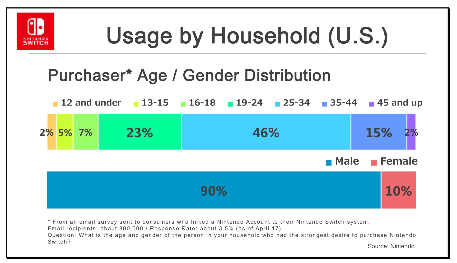 On commence bien entendu par la Nintendo Switch : elle a majoritairement été achetée par des hommes de 25-34 ans aux États-Unis.