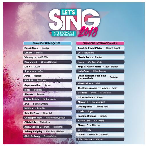 Les joueurs de Let’s Sing 2018 : Hits Français et Internationaux auront le choix entre 40 tubes français et internationaux, en mode solo ou multijoueur, pouvant regrouper jusqu’à quatre joueurs sur Wii/PS4 et deux joueurs sur Switch !