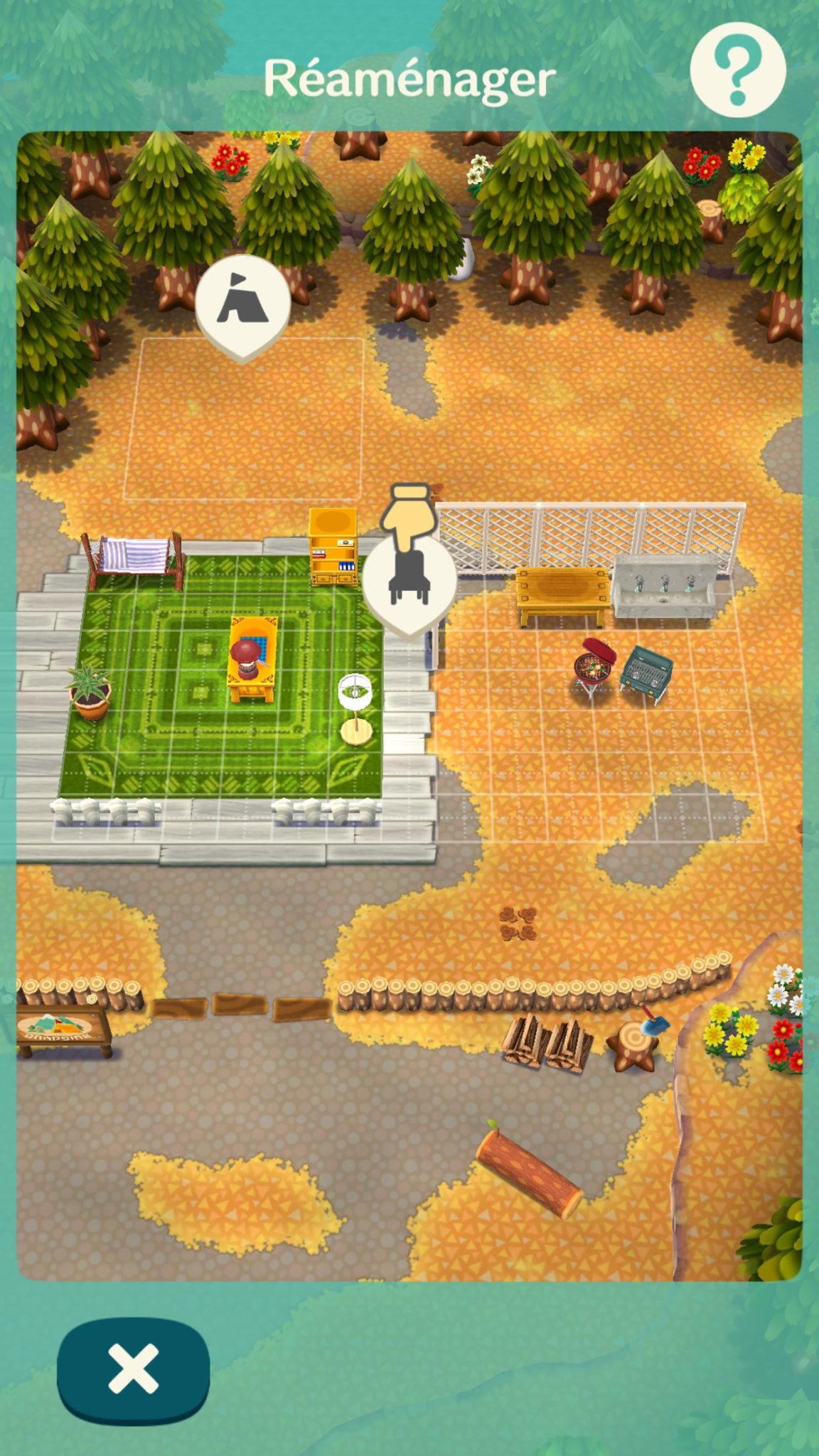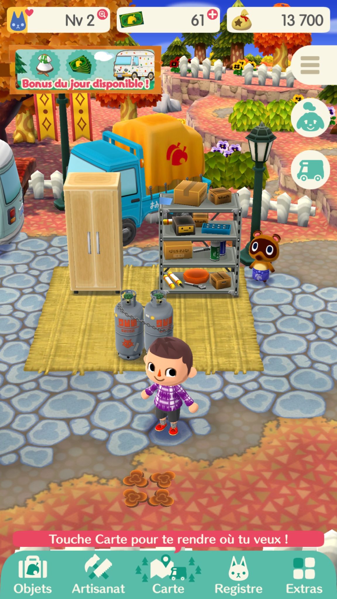 Côté gameplay, qui dit mobile dit simplification à l’extrême, il suffit de toucher l’écran pour se déplacer. De même pour discuter avec vos amis ou interagir avec les éléments de décors. Le jeu se décompose en plusieurs petites zones dont votre camping, en bord de mer ou rivière, en pleine nature, sur une île et d’autres lieux sympathiques. Ce ne sont pas les activités qui manquent entre le ramassage de fruits, les services à rendre aux voyageurs, la chasse aux insectes, la pêche, l’artisanat et la gestion du camping au quotidien. L’artisanat est l’une des nouveautés intéressantes comme nous l’avons évoqué avec Serge et Risette. Rendre service aux campeurs permet d’obtenir des matériaux nécessaires (bois, coton…) à l’artisanat avec un catalogue qui s’enrichira en progressant. Il est également possible d’acheter ses meubles sur la place du marché avec des commerces qui changent chaque jour comme Layette et ses vêtements, Mélimélo et sa boutique de meubles et d’objets décoratifs. D’autres petites nouveautés sont également appréciables comme le filet de pêche pour attraper plusieurs poissons d’un coup ou la souche d’arbre à remplir de miel pour capturer divers insectes. On espère revoir ces composantes dans le prochain vrai jeu de la série. Quoiqu’il en soit, les visiteurs restent un certain temps puis quittent leur lieu de détente et un autre animal peut venir s’y installer. Votre terrain de jeu évoluera par la suite mais on se sent tout de même à l’étroit dans toutes les zones de jeu. Elles sont vraiment petites, à voir sur la longueur comment cela évolue mais il aurait été sympa de pouvoir acheter des extensions de terrain, cela ne semble pas au programme.