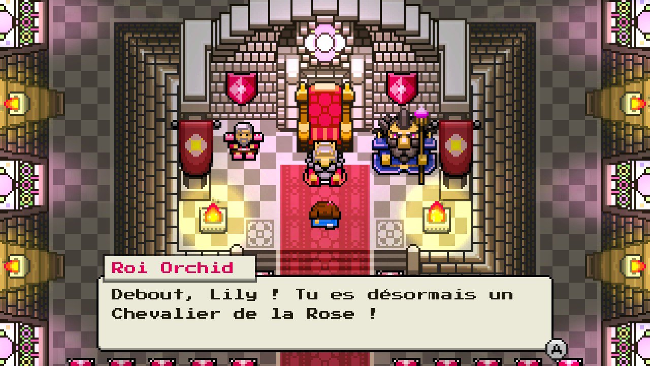 En arrivant dans la salle du trône, où une myriade de chevaliers assiste à une cérémonie, vous comprenez que Lily avait rendez-vous pour être nommée Chevalier de la Rose, par le Roi Orchid en personne. En plus d’hériter du titre, vous êtes équipée d’une épée et d’un bouclier. Maintenant que tous les chevaliers présents dans la salle ont été nommés, c’est au tour du Mage Crokus, frère du roi, d’intervenir pour bénir tout ces newbies de la chevalerie. Une fois les salamalecs passés, lorsque le Chevalier-Commandant demande des volontaires pour dératiser le donjon du château, tout le monde se sauve en courant et il ne reste plus que vous, pour accomplir cette première tâche chevaleresque, pour le bien du Royaume de Blossom !