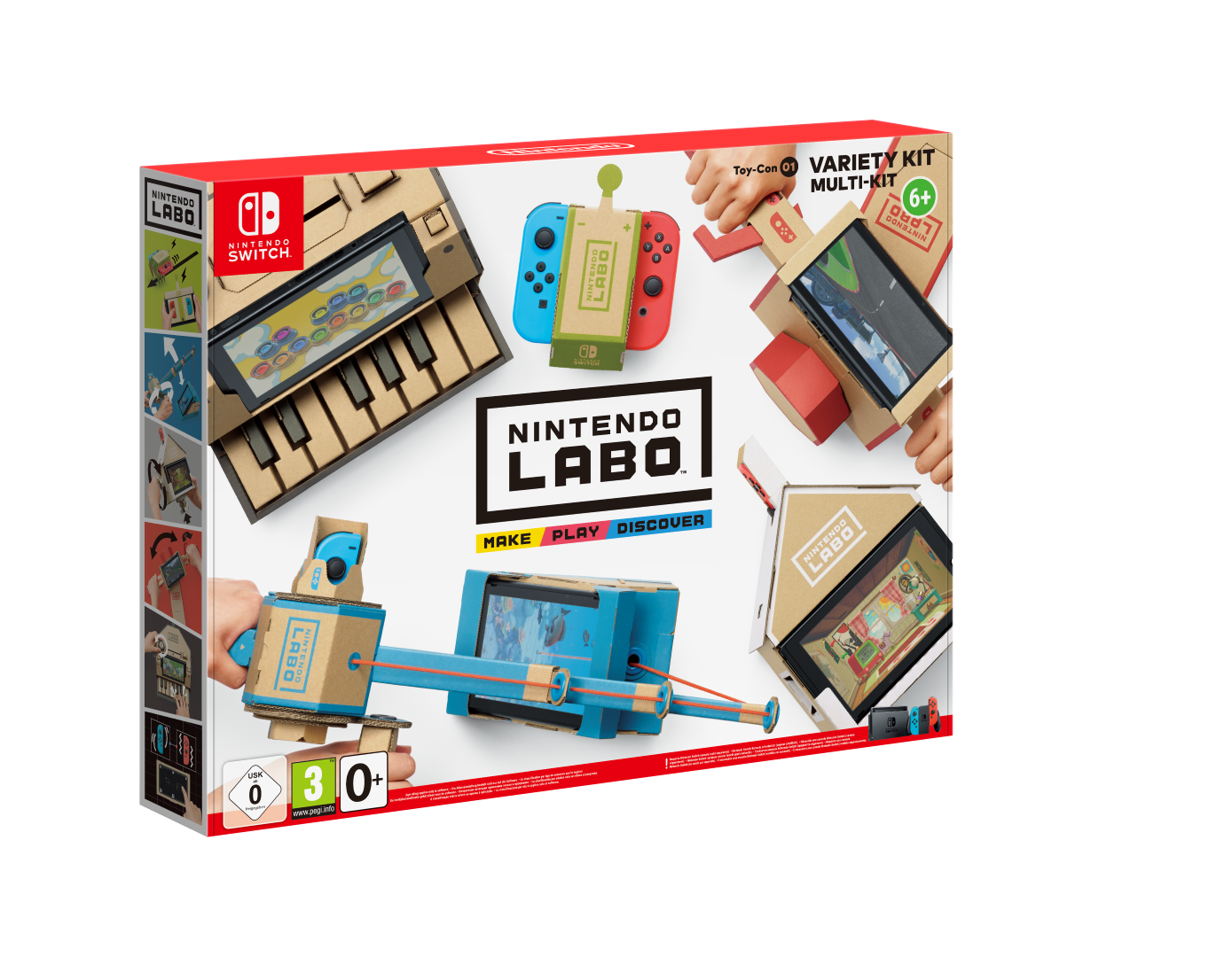 Toy-Con 01, Mutli-Kit  (environ 69€) : 5 objets à construite sont fournis dans ce pack. Une voiture téléguidée, une canne à pêche, un piano, une maison et une moto accompagnent la cartouche compatible Nintendo Labo.