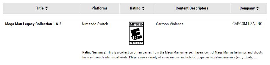Cela fait déjà deux mois et demi que Mega Man 11 mais aussi Mega Man Legacy X et X2 ont été annoncés par Capcom à l’occasion des 30 ans du Blue Bomber. A cette occasion, nous apprenions également que les deux Mega Man Legacy Collection allaient sortir sur Nintendo Switch. Et bien voilà que ces derniers ont été classifiés ESRB tout récemment pour Nintendo Switch et dans un seul et unique intitulé : « Mega Man Legacy Collection 1&2 ».