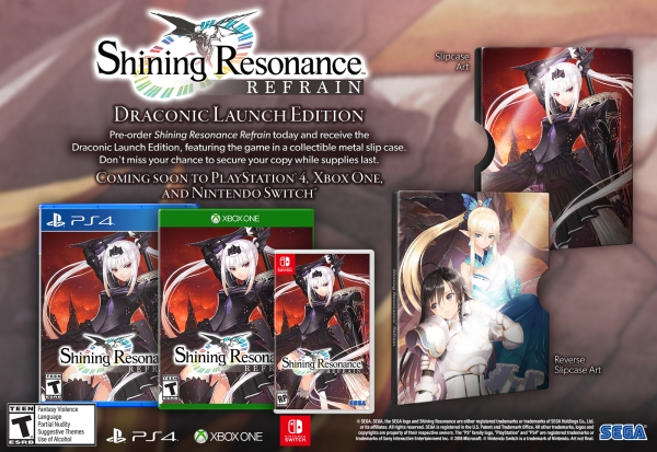 Ceux qui précommandent Shining Resonance Refrain sur PS4, Xbox One X et Nintendo Switch recevront le jeu dans un boîtier métallique collector à l’effigie d’Excella, Sonia et Kirika.