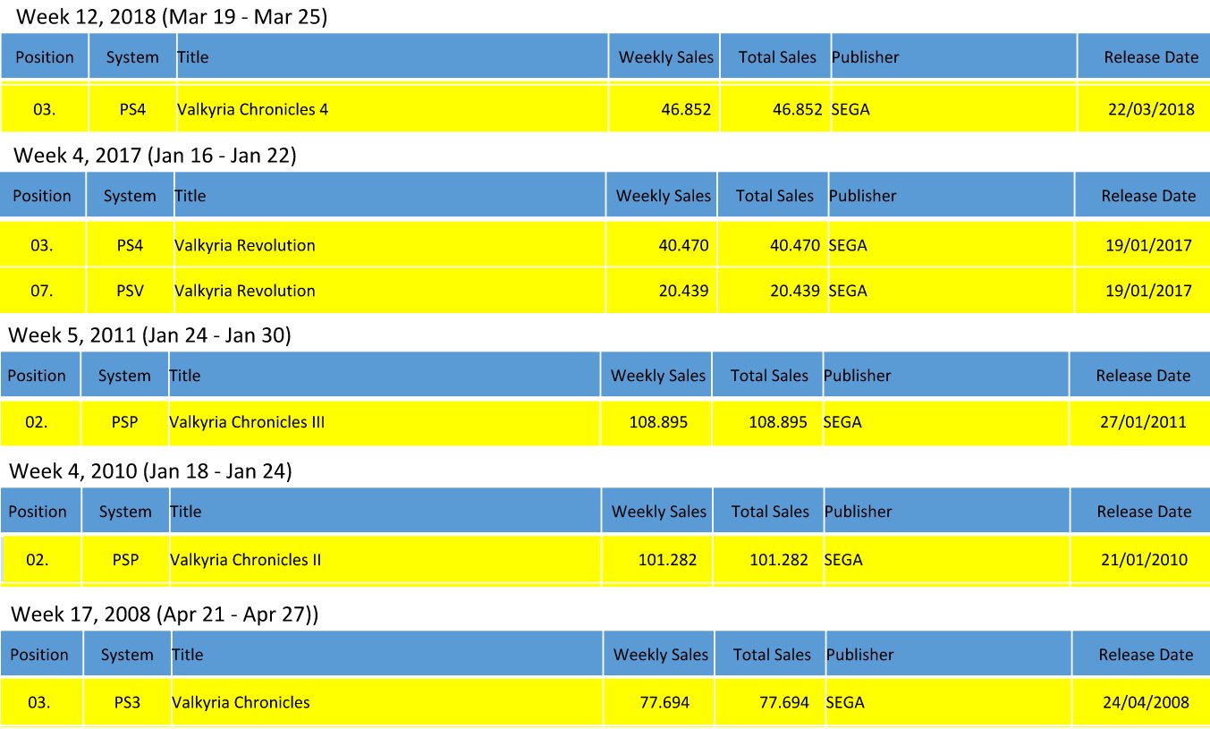 [amazon_textlink asin=’B07CCWH5ZS’ text=’Valkyria Chronicles 4′ template=’ProductLink’ store=’nintendotownf-21′ marketplace=’FR’ link_id=’09eb0b92-3327-11e8-8ef6-bbebc31afab2′] est le pire lancement de la série, même derrière Valkyria Revolution. Sega doit désormais espérer de bonnes ventes de la version Switch qui arrive cet été pour arrondir le tout.