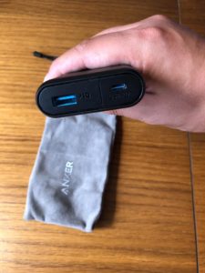 Pour bien faire les choses, nous avons eu en test la version PowerCore 20100. La batterie est livrée avec une pochette de transport et un câble USB-C <=> USB-C pour brancher l’engin à la Nintendo Switch et donc faire la recharge. Un port USB-3 est aussi disponible pour charger d’autres périphériques comme un portable.  Sans branchement, un bouton en face vous permet à tout moment de savoir où en est l’état de chargement de votre batterie via 4 diodes LED bleue. 25%, 50%, 75% et 100%. Lors de la consultation les voyants LED restent allumés 10 secondes. Ce même bouton vous permet d’arrêter de charger votre console avec la batterie si elle y est branchée. En appuyant deux fois sur le bouton, la charge s’arrête et il faudra appuyer à nouveau sur ce bouton pour relancer le processus de charge.