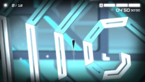 Vous incarnez Spectrum, qui n’a aucun rapport avec le Pokémon de la première génération dont il emprunte le nom, mais qui s’apparente plus à une boule spectrale possédant trois yeux. Et en manipulant ce petit être, vous allez devoir parcourir, entre cubes verts et polygones convexes bleutés, les différents niveaux qui vous sont proposés tout au long du jeu. Il existe quatre sections différentes selon le thème de couleur qu’elles arborent, mais aussi par la difficulté qui les distinguent. Il faudra les parcourir dans l’ordre pour débloquer alors les suivantes ! Ainsi, 10 stages sont à retrouver dans chaque section, et de la même façon, ils sont à retrouver dans un ordre de difficulté croissante.