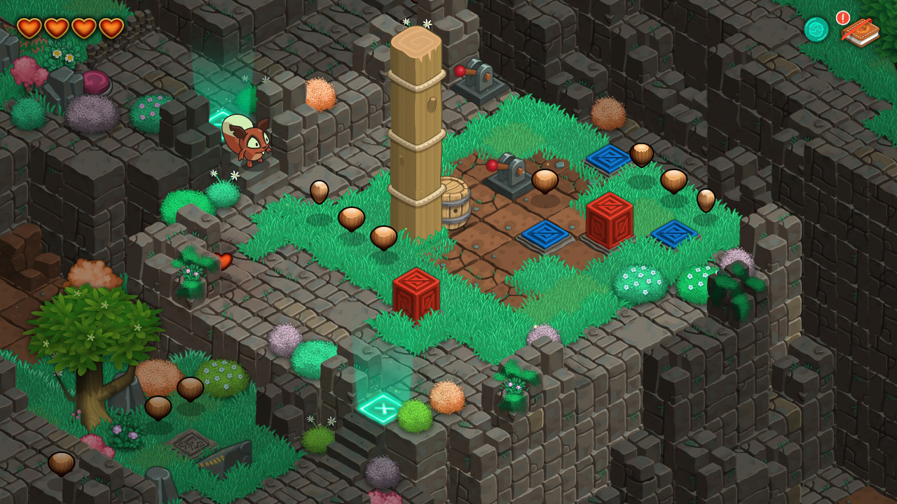 La structure du monde se base donc sur votre apprentissage de ces nouvelles techniques, le tout pouvant s’explorer librement, le monde est ouvert et assez grand, d’ailleurs vous pourrez effectuer des déplacements rapides entre les diverses zones moyennant que vous arriviez à vous positionner sur l’emplacement du téléporteur. L’exploration libre liée à l’apprentissage de nouveaux mouvements incite à revenir explorer de nouvelles zones et récolter toutes les noisettes éparpillées de partout dans le monde (qui sont le seul et unique collectible du jeu).