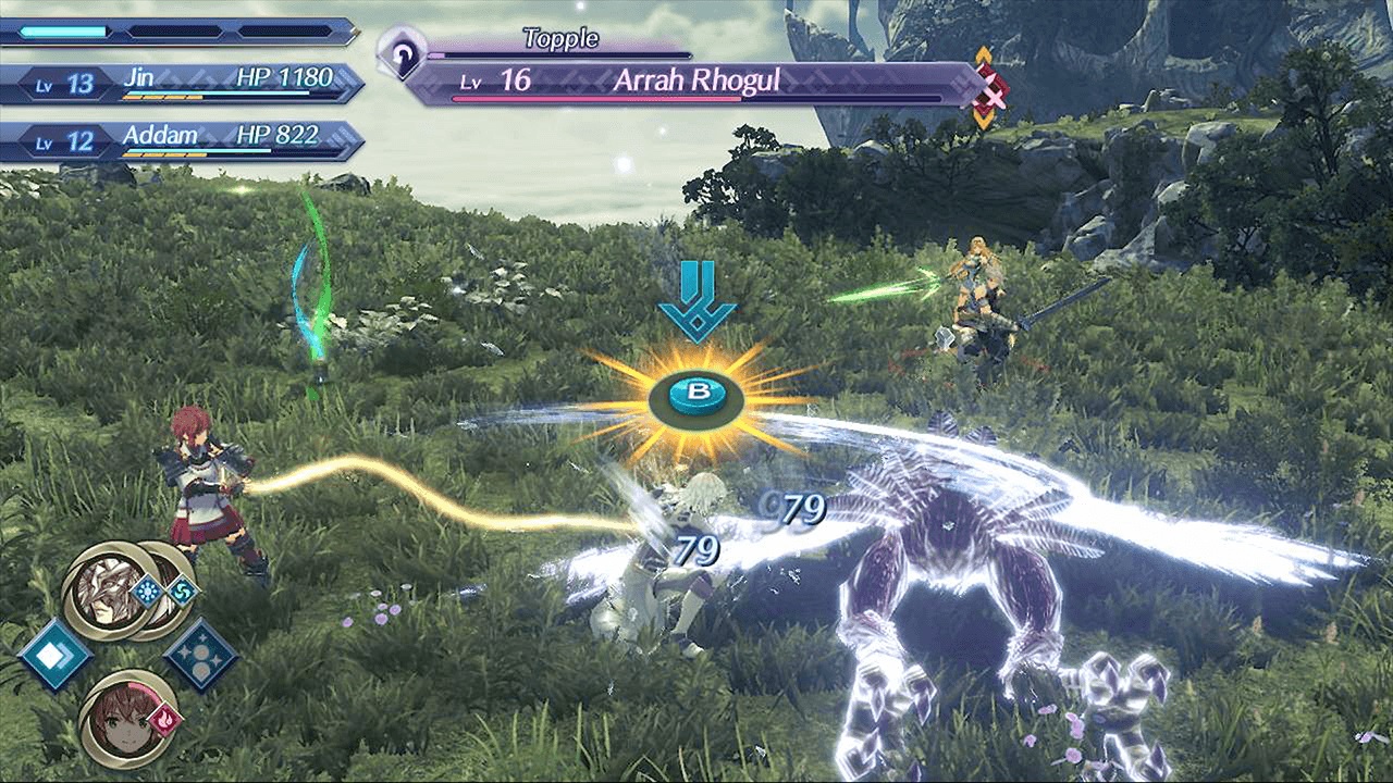 Nous venons de vous faire un long rappel sur le système de combat de Xenoblade 2 et nous avons même omis de parler de certaines choses comme le sociogramme de vos personnages. Ce fameux arbre de compétences passives qui renforce vos compétences en combat ou qui vous permet d’explorer le monde d’Alrest avec plus d’efficacité. Imaginons que vous deviez trouver quelques légumes pour cuisiner un plat, vous serez bien content d’avoir renforcé la compétence botanique de Bridgid. Et les compétences d’explorations de ce genre sont nombreuses. La progression de cet arbre des compétences diffère selon que vous ayez affaire à un Pilote ou une Lame. Pour un Pilote il s’agit de distribuer de simples points de compétence sur les différentes compétences passives ou même renforcer le niveau de vos arts de combats avec d’autres points que vous remportez en combat. Pour les Lames, il s’agit de remplir certains objectifs bien précis comme le fait d’utiliser un certain art Spécial 5 fois ou effectuer un combo de Pilote complet 10 fois voire cuisiner un certain plat ou trouver un certain nombre de repères durant vos péripéties sur Alrest. Au-delà de cela et pour aller en douceur dans la nouveauté, sachez quand dans Torna, vos protagonistes Pilotes et Lames sont réparties en équipe. L’équipe Lora se compose de Jin et Haze, celle d’Addam se constitue de Mythra et Minoth puis celle d’Hugo met en avant Bridgid et Aegaeon. Vous ne pouvez pas changer les lames de Pilote contrairement à Xenoblade 2, tout est déjà bien fixé. Chaque équipe partage leurs points d’expérience et leurs niveaux. C’est-à-dire que si Lora est niveau 13 alors Jin et Haze également. Qu’est-ce qui change si Jin et Haze ne sont là que pour vous aider à effectuer des combo de lame, demanderez-vous ? Effectivement, nous avons fait un si long rappel sur le système de Xenoblade 2 que nous sommes toujours dans l’optique que Torna soit fait de la même manière. Mais en fait les Lames sont jouables cette fois-ci dans Torna ! Il est possible via la croix directionnelle de switcher de personnages de votre équipe en plein combat ou durant vos phases d’exploration ! Cette fois-ci vos lames ne se contentent pas seulement de tourner autour de vous en combat en vous aidant juste à faire des combo de lame ou à aider votre Pilote à sortir des arts de combat. Chacun des membres de votre équipe en combat agit et chacun à un rôle d’attaque ou de soutien.