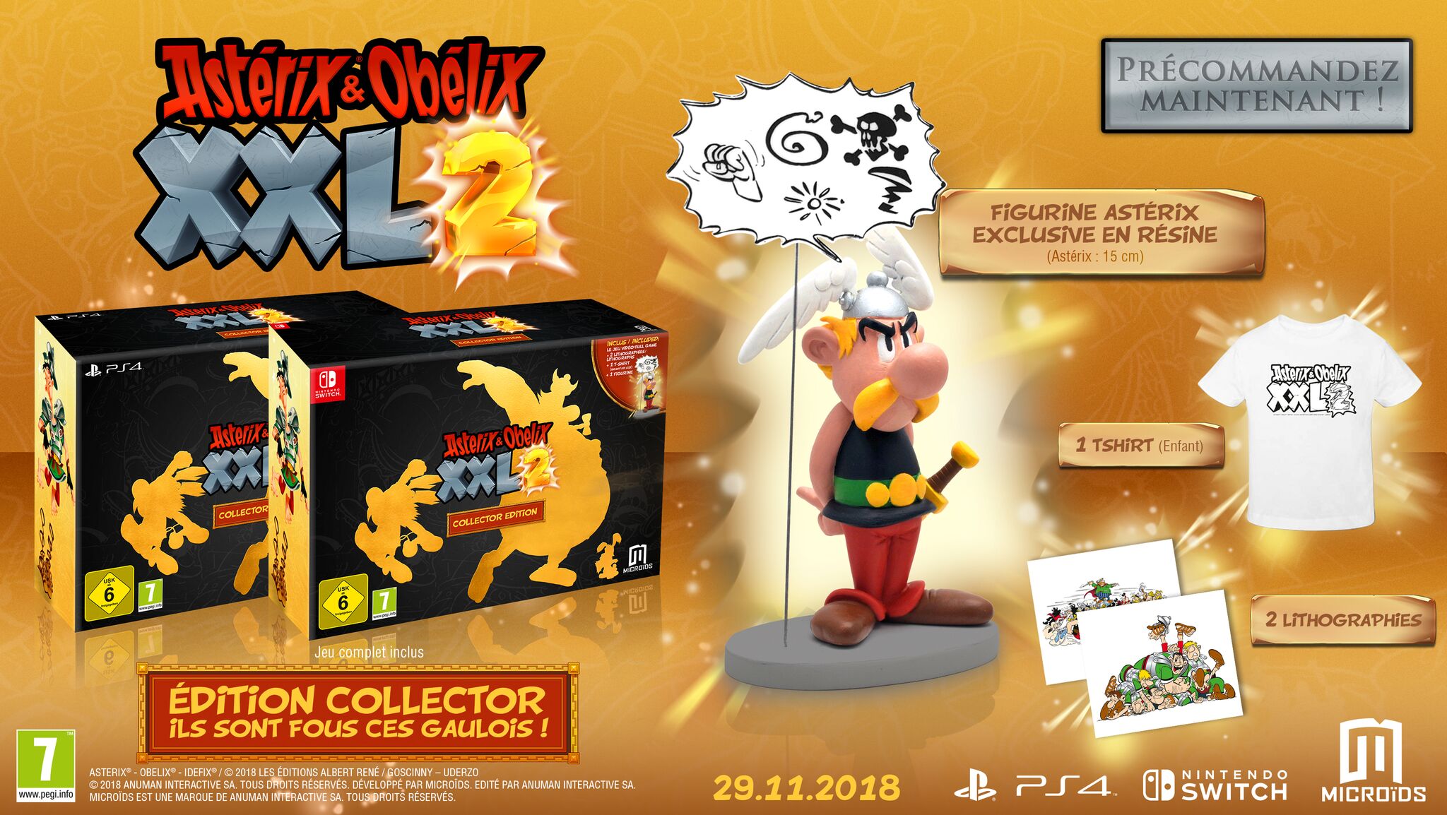 Astérix et Obélix XXL2 sortira dans une édition limitée – comprenant le jeu et 3 petites figurines Astérix, Obélix et Idéfix – ainsi qu’en édition collector, idéale pour toute la famille – composée du jeu, d’une figurine Astérix en résine de 15cm, d’un T-shirt exclusif taille enfant et de 2 lithographies !