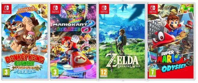 Que vous préférez vous affrontez à coups de bananes et de carapace lors de courses endiablées avec Mario Kart 8 Deluxe, partir à l’aventure avec The Legend of Zelda :Breath of the Wild ou Super Mario Odyssey ou sautez de plateforme en plateforme, seul ou en duo, avec Donkey Kong Tropical Freeze, il y en a pour tous les goûts sur Nintendo Switch !