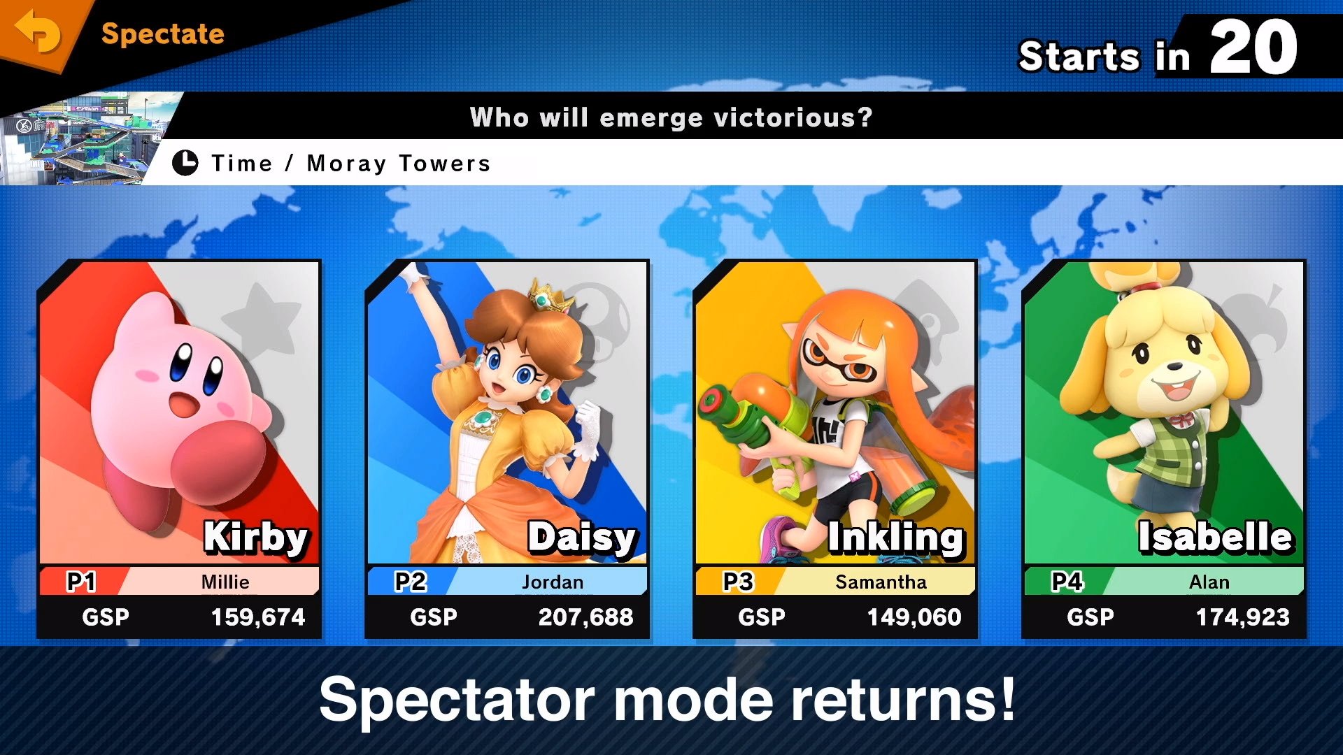 - Jeu sans fil et jeu en ligne : Super Smash Bros. Ultimate permet aux joueurs d’affronter leurs amis et les membres de leur famille en mode local sans fil* ou en ligne**. Les modes « Pour le fun » et « Pour la gloire » qui existaient dans Super Smash Bros. for Wii U et Super Smash Bros. for Nintendo 3DS ne sont ici plus des options. À la place, les groupes de combattants sont constitués selon trois facteurs. Le premier permet aux joueurs de définir leurs règles préférées pour les combats et de s’associer avec d’autres joueurs ayant choisi les mêmes préférences. Ensuite, la puissance Smash est aussi prise en compte pour la recherche d’adversaires mais elle sert également de classement en ligne pour rassembler les joueurs de niveau similaire. Enfin, la proximité des joueurs qui sont proches géographiquement est également prise en compte.
