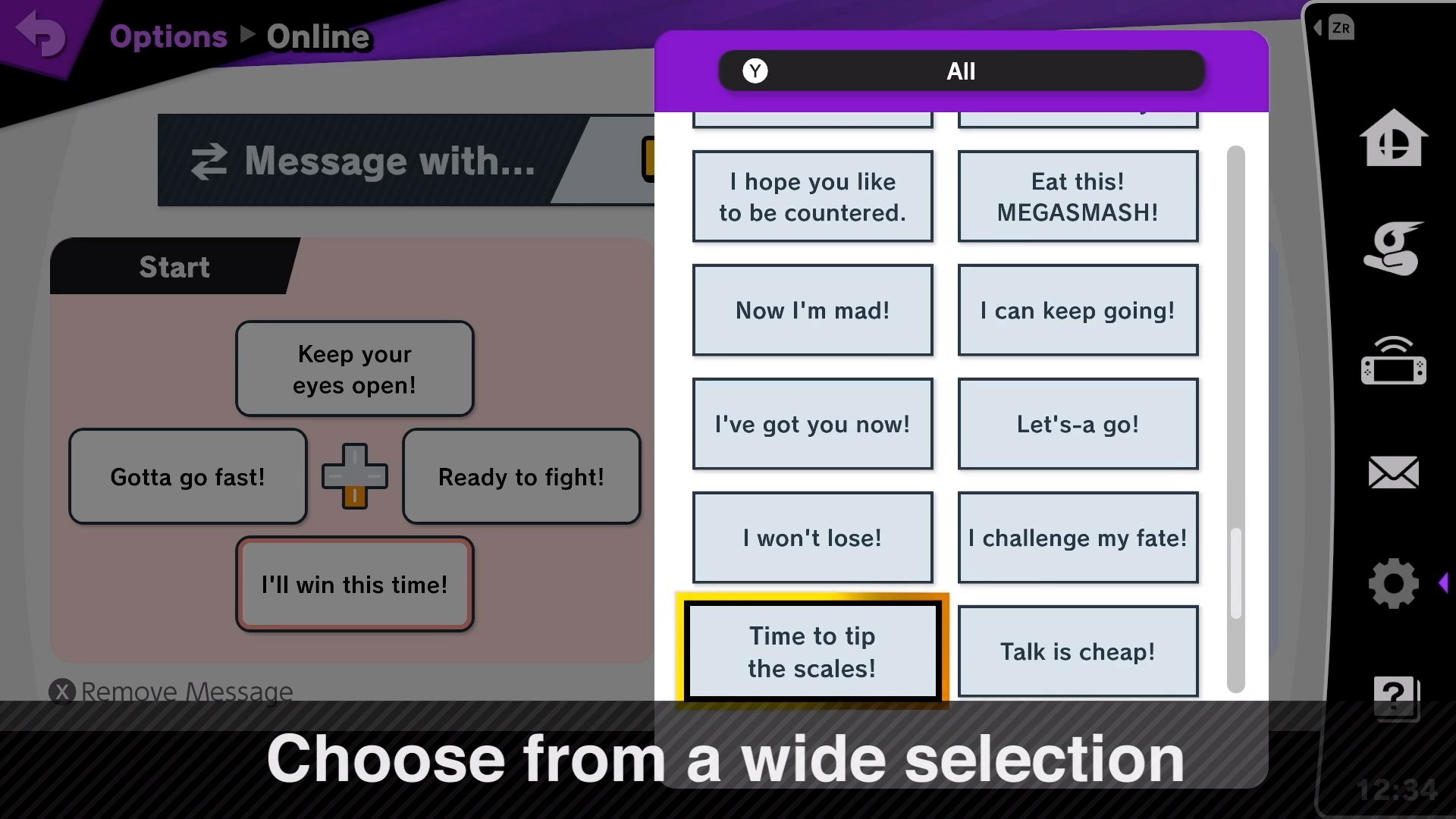 - Messages courts : les joueurs peuvent sélectionner des messages courts prédéterminés qu’ils pourront assigner avec les boutons directionnels pour les envoyer à d’autres joueurs avant et après les combats. Le jeu propose une large variété de messages présélectionnés.