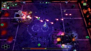 Car oui HyperParasite est très clairement orienté années 80, cela n’échappera à personne avec le style graphique dans les menus reprenant les couleurs néons et flashy propres à cette période, en prenant également la vue du dessus en jeu ainsi que les artworks “cyberpunk” réalistes pendant les chargements renforçant cet hommage ainsi qu’une bande-son Synthwave et nous avons ici la panoplie complète de l’ambiance 80’s remise au goût du jour.