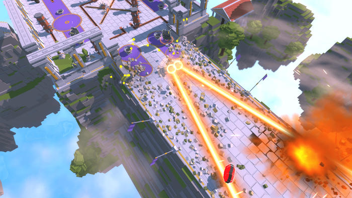 Concernant le gameplay vous disposerez de 2 armes principales échangeables à tout moment pour tirer sur les ennemis arrivant vers vous ainsi que la possibilité de lancer une attaque tournoyante pour détruire les parties de l’environnement proches de vous (ou ennemis) ainsi que renvoyer des projectiles comme des boulets de canon, des missiles ou des valises remplies de C4 (on reste bien dans le loufoque).