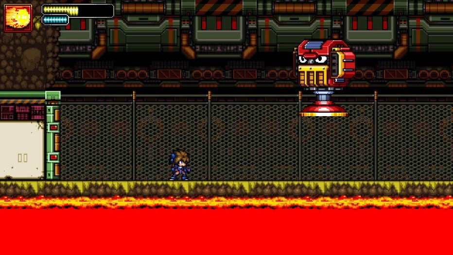 Mais, passons. Manette en main, de nouveau une sensation positive : c’est immédiatement intuitif, le petit tutoriel sous forme d’un niveau très simple n’est pas du tout intrusif, ni trop long, comme peuvent l’être certains tutoriels. Ajoutant à cette sensation agréable d’un jeu ou les commandes seront aisées à se souvenir, même après une longue période de pause. Cependant, vous remarquerez vite les limites de gameplay, peut-être trop proche de Megaman premier du nom et pas assez révolutionnaire (une fois n’est pas coutume…). Bien sûr vous aurez un bouton d’attaque spéciale, un pour changer d’attaque spéciale, un autre pour tirer et un pour sauter, vous avez le stick gauche pour contrôler la direction de marche et un double stick pour courir, et… c’est tout. Pas d’accroupis, pas de tir vers le haut. C’est assez déstabilisant de revenir à une mécanique aussi austère lorsqu’on en aurait besoin, par exemple : face à une machine accrochée à un plafond trop haut.