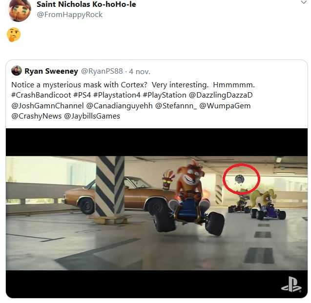 C’est au travers d’une vidéo promotionnelle postée par Sony appelée « Time to play » qu’un extrait du jeu de courses Crash Team Racing qu’un indice à été repéré par les viewers les plus assidus. Un nouveau masque inconnu dans la série flotte aux côtés de Cortex le némésis de Crash.