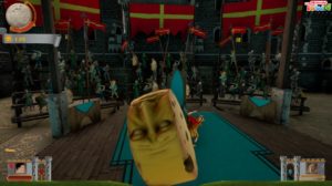 Certains de ces niveaux changeront aussi d’objectif : par exemple, via une course pure et dure, ou via des descentes sur la même route et en même temps qu’un autre boulet, où il faudra défoncer le plus de choses possibles sur votre passage et finir la course en rentrant, via un saut, dans un panneau en bois avec des trous (un peu façon labyrinthe à bille ou flipper), chaque trou représentant un multiplicateur de points. Malheureusement, je n’ai pas pu voir d’autres modes de jeu, même s’il est possible qu’il y en ait : le jeu étant victime de crash inopinés en jeu un peu trop fréquents encore, en espérant que ceux-ci soient absents de la version finale du titre, car si l’humour et les commandes répondent bien, que la stratégie et le fun sont aussi au rendez-vous, devoir relancer le jeu toutes les demi-heures devient vite gavant.