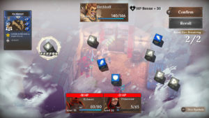 Mais ce n’est pas tout dans l’aléatoire, vous allez une fois la bonne carte choisie, lancer des dés, au départ vous en aurez très peu, ces dés vont avoir des effets positifs ou négatifs selon leurs types. Ils vont pouvoir affecter les dégâts que vous allez causer, vous faire tirer une carte après votre attaque, vous faire rejouer un tour, ou alors cumuler assez d’étoiles pour activer le pouvoir secondaire de votre carte. Là aussi c’est toute une gestion, lors des missions vous allez pouvoir dégoter de nouveaux dés en fin de combat, vous allez donc pouvoir choisir les faces des dés et donc influencer sur la chance (si votre dé a 3 faces étoiles vous allez plus facilement tomber dessus que s’il n’en possède qu’une). Vous allez aussi au fur et à mesure de vos gains de niveaux débloquer de nouveaux emplacements de dés et donc en avoir de plus en plus à lancer (vous pouvez équiper jusqu’à six dés !).