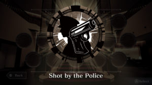 Une seule s’impose à nous à ce moment, celle d’ouvrir la porte. Le policier nous indique seulement qu’un voisin a rapporté entendre d’étranges bruits dans la chambre et souhaite jeter un œil à votre chambre. Sans que vous ne puissiez rien répondre, il s’impose dans votre chambre, finit par trouver la femme dans la salle de bain et se retourne son arme pointée sur vous. La scène se poursuit dans la confusion et dans l’agitation et alors que Karaki Makoto se débat pour échapper au policier, un coup finit par partir et tuer notre héros.
