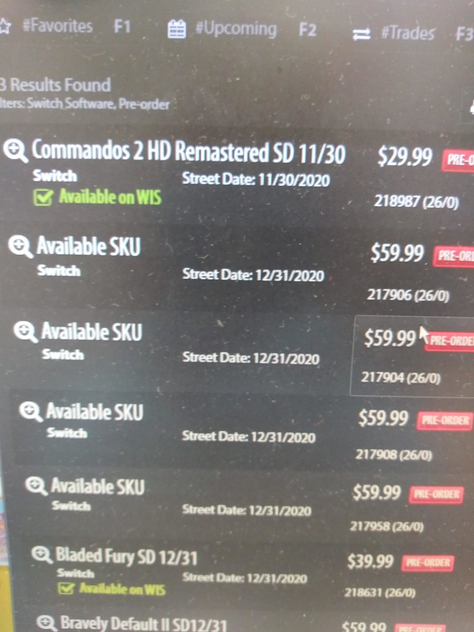Une image commence à faire le tour du net. Elle semble être une photo prise à partir de la base de données interne de GameStop. Quatre titres mystères sont répertoriés pour la Nintendo Switch, chacun portant le nom « Available SKU ». Ils ont tous une date de sortie provisoire au 31 décembre et un prix de 59,99 $.
