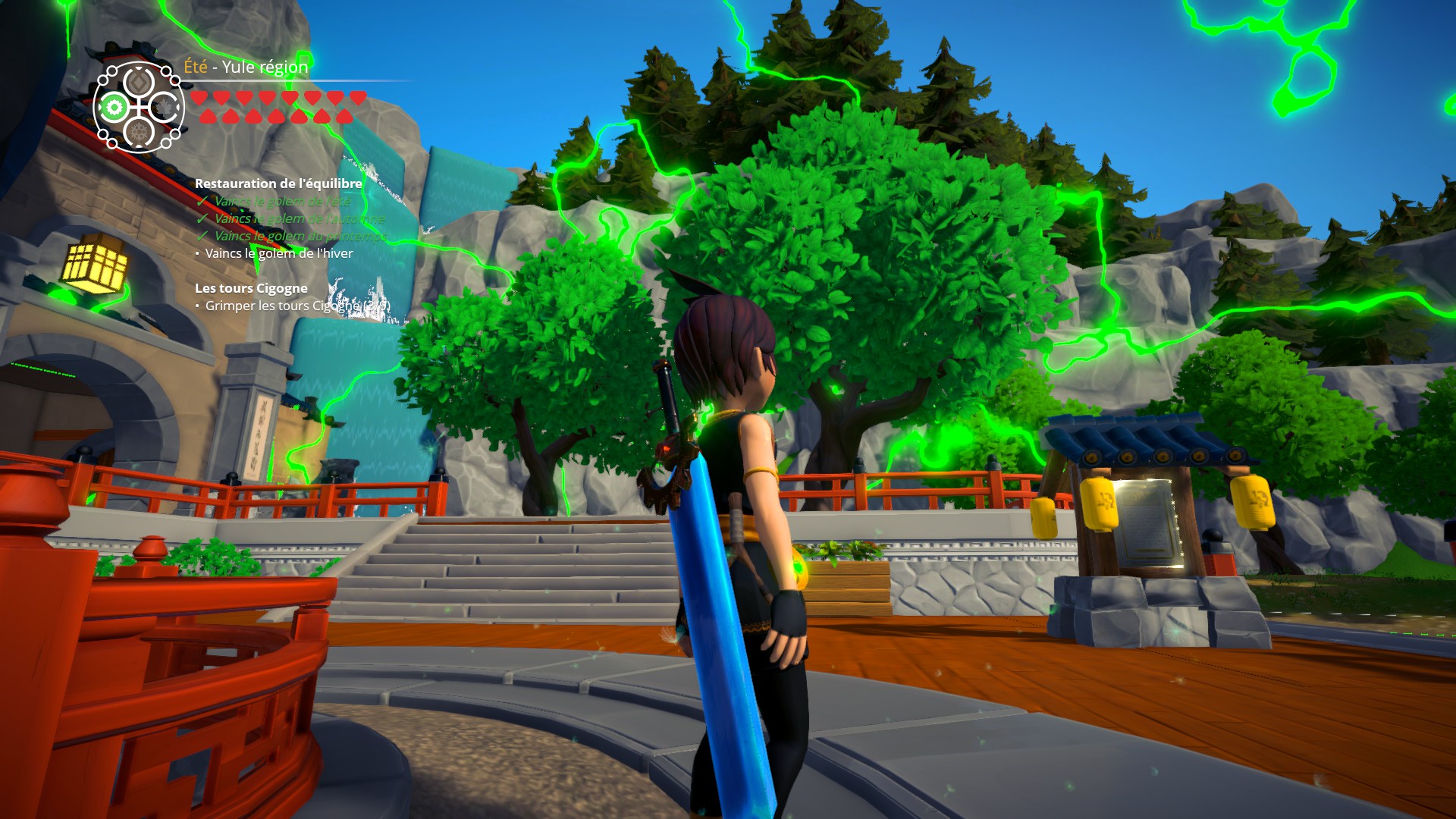 Au niveau des graphismes, ils sont en Cel-Shading et proposent de superbes paysages avec un aspect cartoon. C’est un vrai plaisir de se promener dans les villages du jeu, inspirés de l’architecture asiatique, ou en bordure d’un lac ou d’une ou dans une forêt. L’utilisation du Cel-Shading correspond bien au scénario du jeu et on se plaît à faire passer les différentes zones d’une saison à l’autre pour en découvrir les secrets ou simplement admirer la beauté des paysages. L’animation pour passer d’une saison à l’autre est particulièrement réussie : sorte de sphère semi-transparente qui s’étend transformant au passage le paysage.