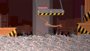 Au fil de votre aventure vous débloquerez quelques compétences permettant un peu de diversifier le gameplay, par exemple la capacité de ralentir le temps pour vous aider à plus facilement esquiver des obstacles et dangers vous fonçant droit dessus, ou encore le power up le plus original qui est la capacité de détacher vos bras pour résoudre des phases de puzzle un peu plus spéciales. Un exemple parmi les quelques-uns croisés est celui d’attacher chacun des bras à des points d’ancrage permettant de manipuler une pince pour attraper Troie et le relâcher plus haut. Le tout répondant toujours à la même physique complètement absurde. La manipulation de leviers et autres boutons se trouve également très complexe… Une autre application est aussi la possibilité d’accrocher un bras à un point d’ancrage pour s’en servir de corde et se balancer…