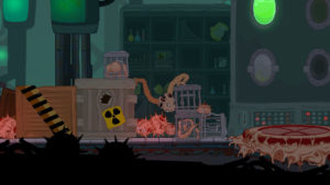 Que ce soit clair de suite, Struggling n’est pas vraiment un jeu à mettre sous les yeux des plus jeunes, les graphismes cartoon trash et grotesques montrent des corps mutés, du mucus, des viscères et autres joyeusetés sortant de l’imaginaire, on l’imagine assez torturé, des designers de chez Chasing Rats Games.
