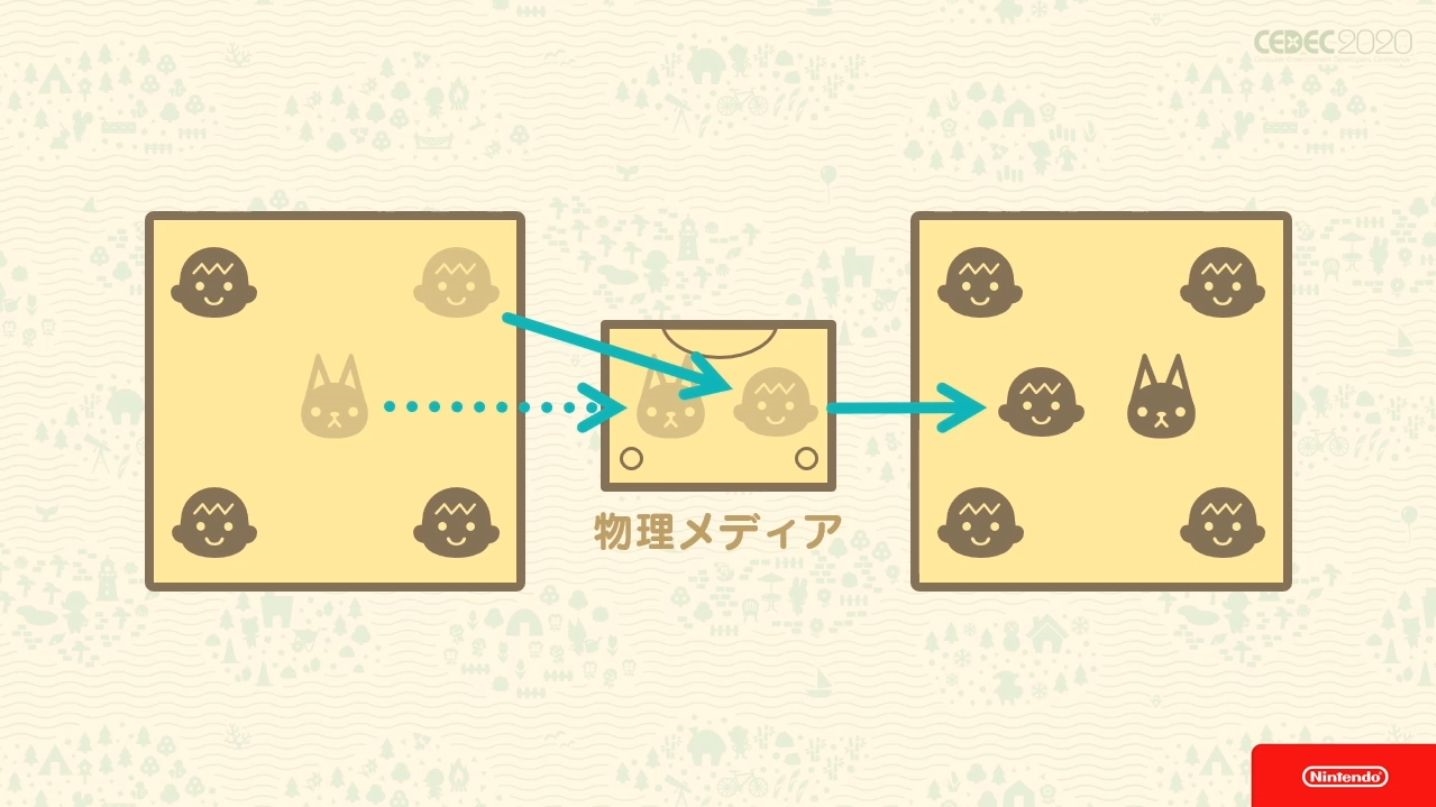Une des fonctionnalités d’Animal Crossing, c’est de pouvoir partager ses données de sauvegarde avec plusieurs joueurs. Un Village devient une donnée de sauvegarde et plusieurs joueurs peuvent s’y trouver. Tandis qu’un joueur fait grandir des fleurs et des arbres puis envoie des lettres, un autre joueur du même village jouant après lui peut s’apercevoir de ces changements. On peut dire qu’il s’agit d’une expérience de jeu de communication asynchrone dans laquelle plusieurs joueurs jouent à divers moments et en partagent les résultats.