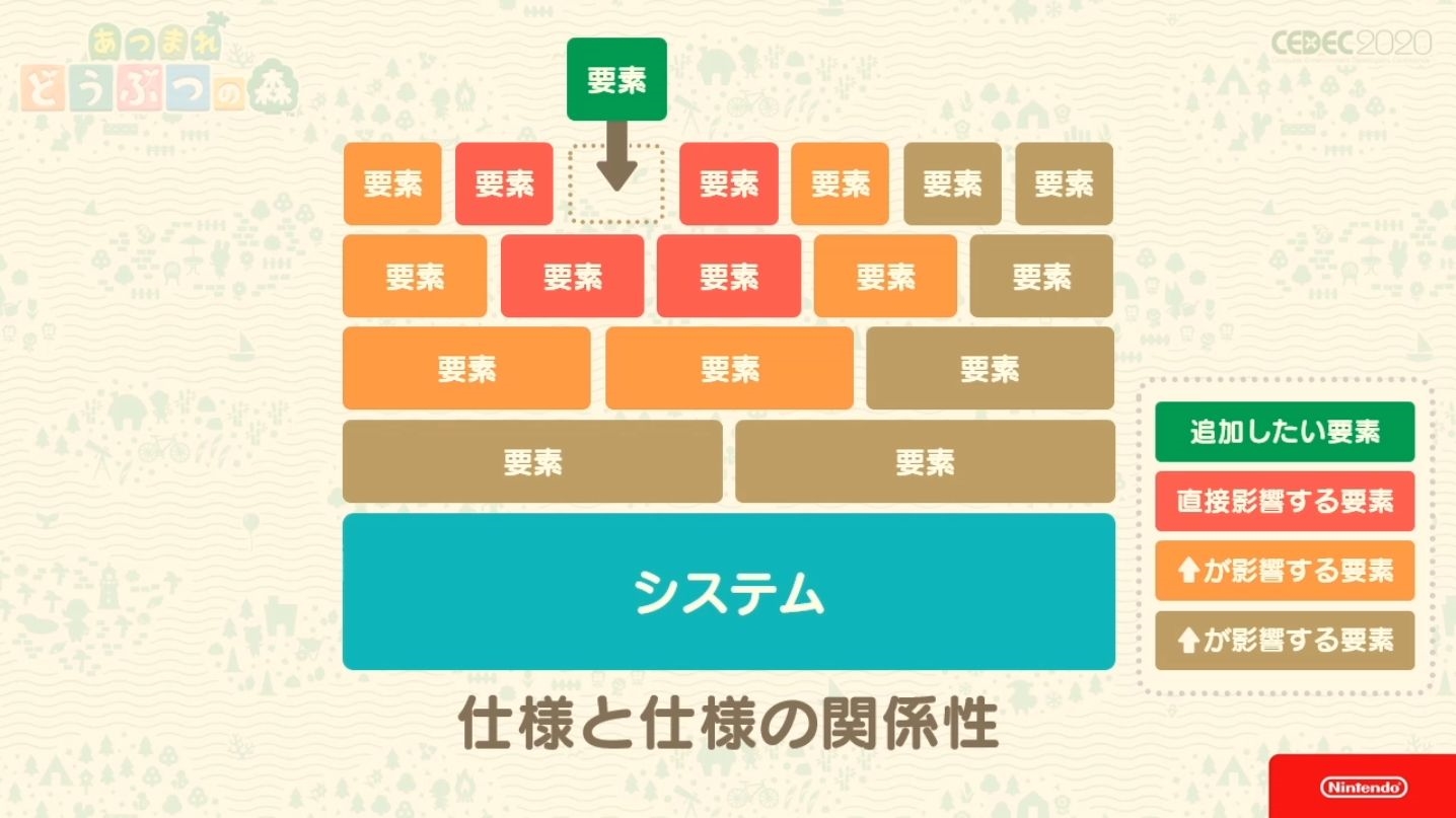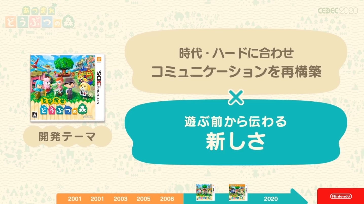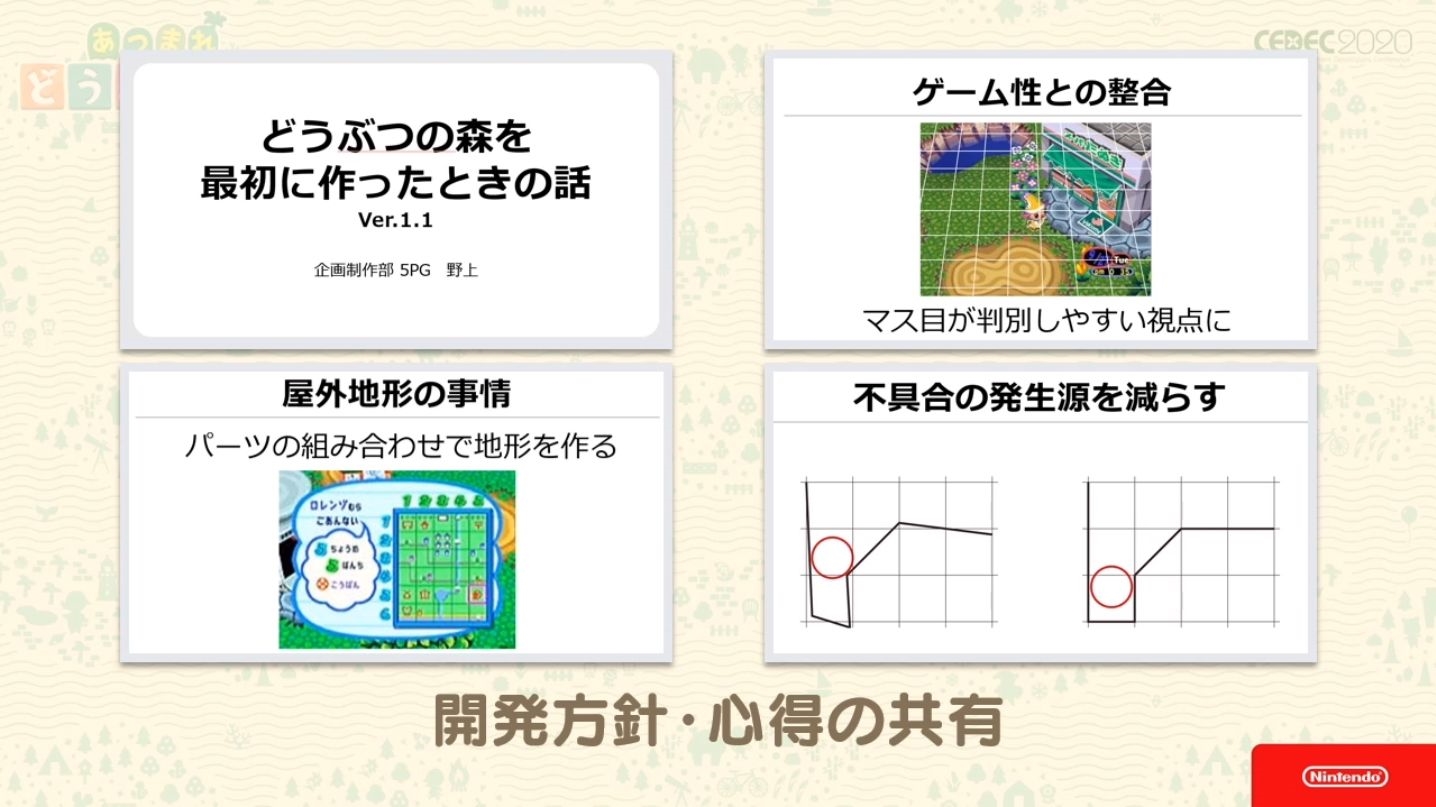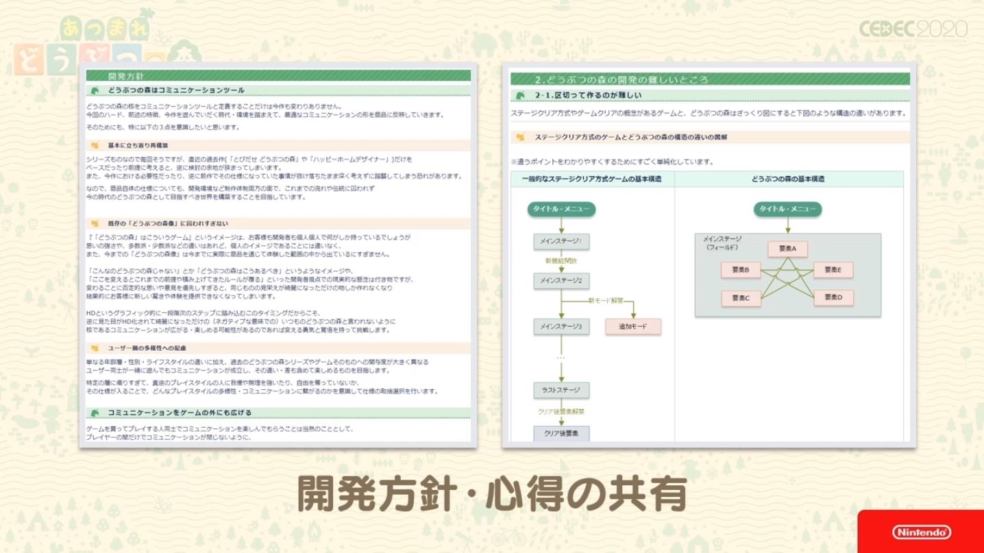Durant le Cedec 2020, un évènement rassemblant de nombreux développeurs japonais, Nintendo s’est livré à une conférence sur les éléments constituant les concepts de la série Animal Crossing et leurs objectifs pour Animal Crossing : New Horizon.