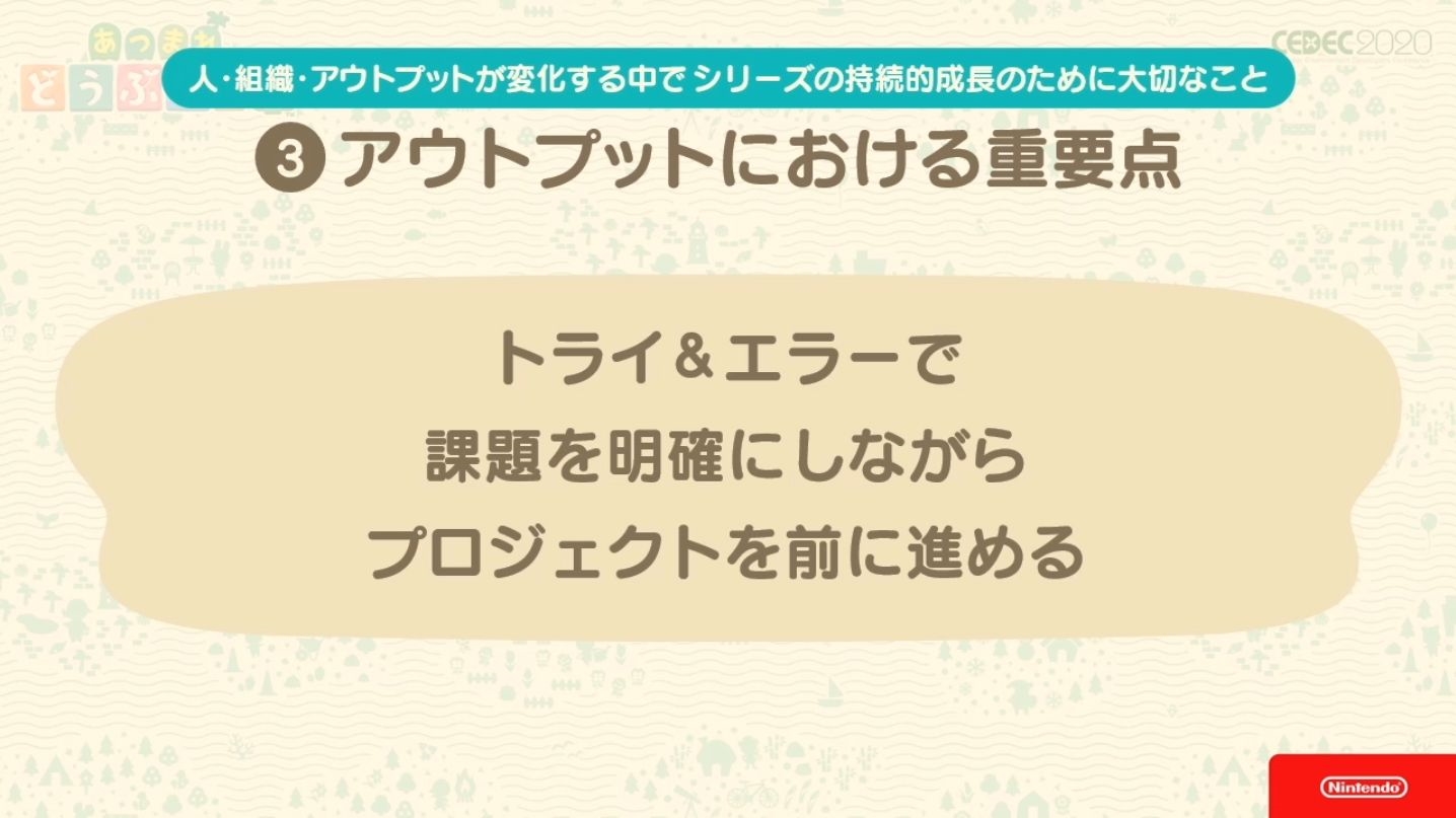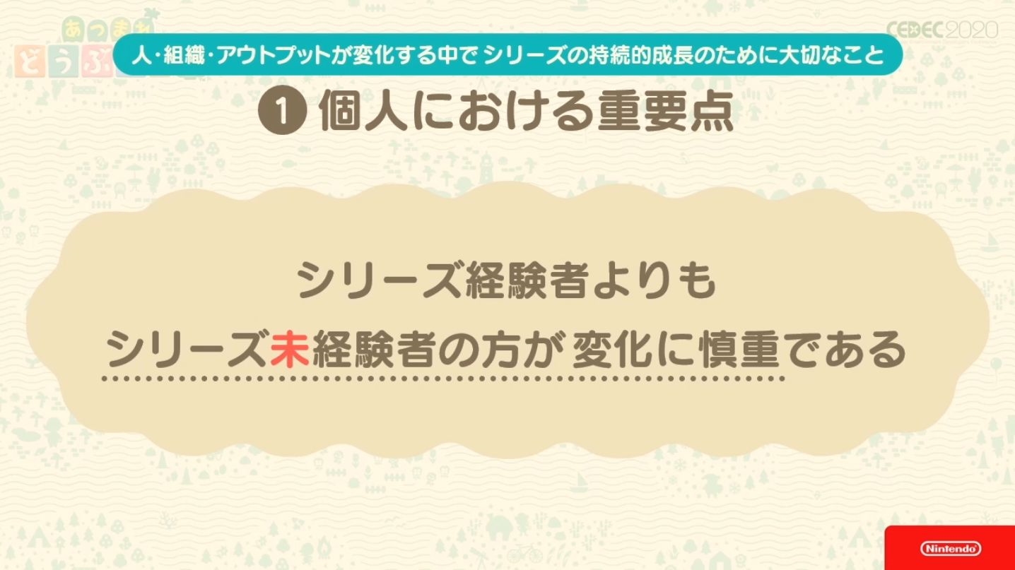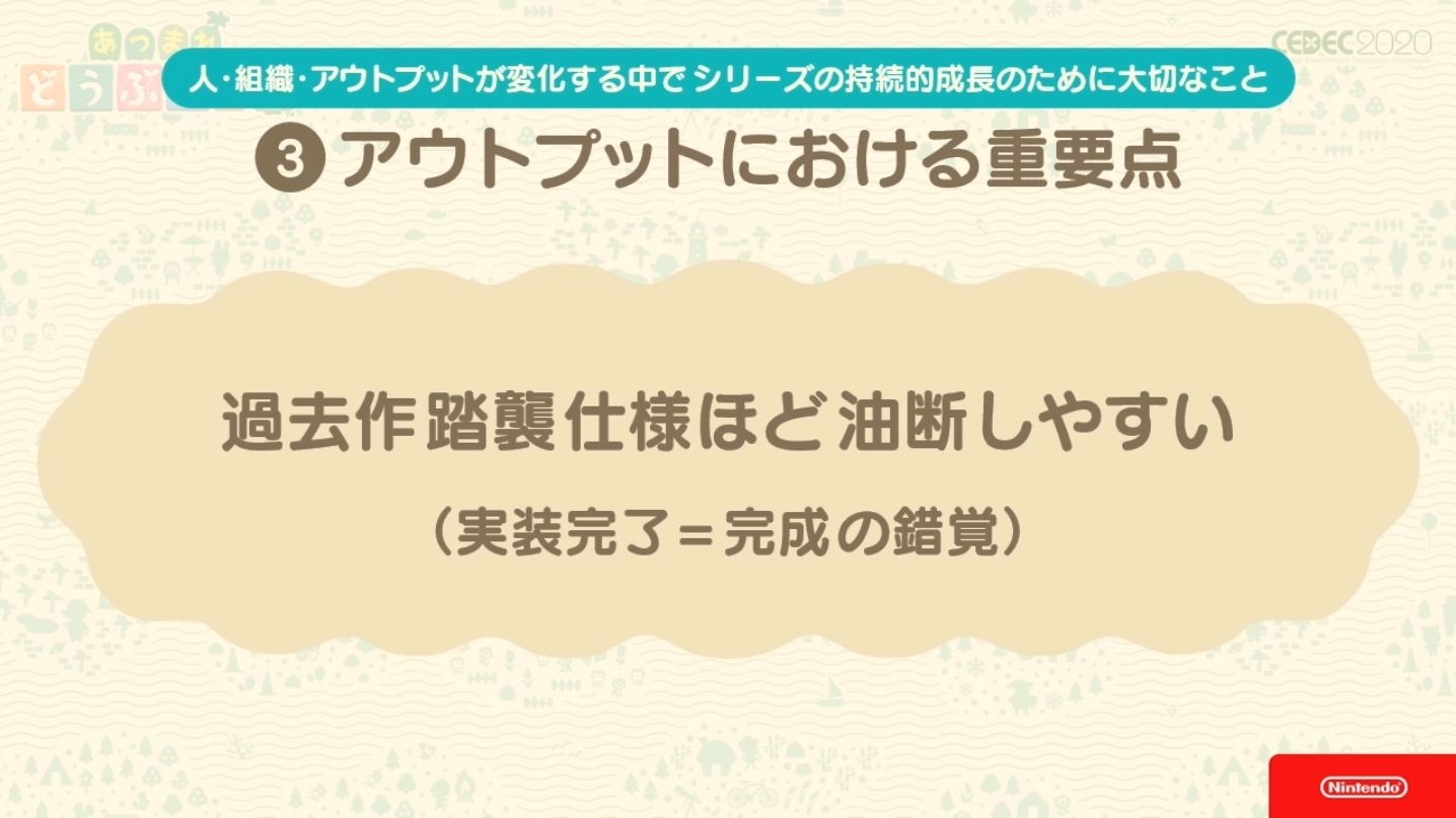 Kyogoku-san liste ensuite ce qui a été retenu dans le développement de la série Animal Crossing au fur et à mesure que les équipes et organisations changeaient à chaque opus.
