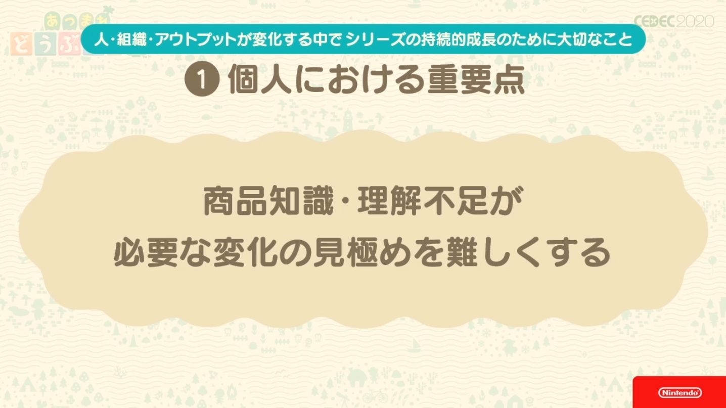 Dans cette seconde partie, les “Transition dans l’organisation du développement” de la série Animal Crossing ont été présentés. Cela fait maintenant 19 ans, en 2001, le premier jeu de la série Animal Crossing sortait sur Nintendo 64, mais depuis l’organisation autour du développement de chaque opus a changé.