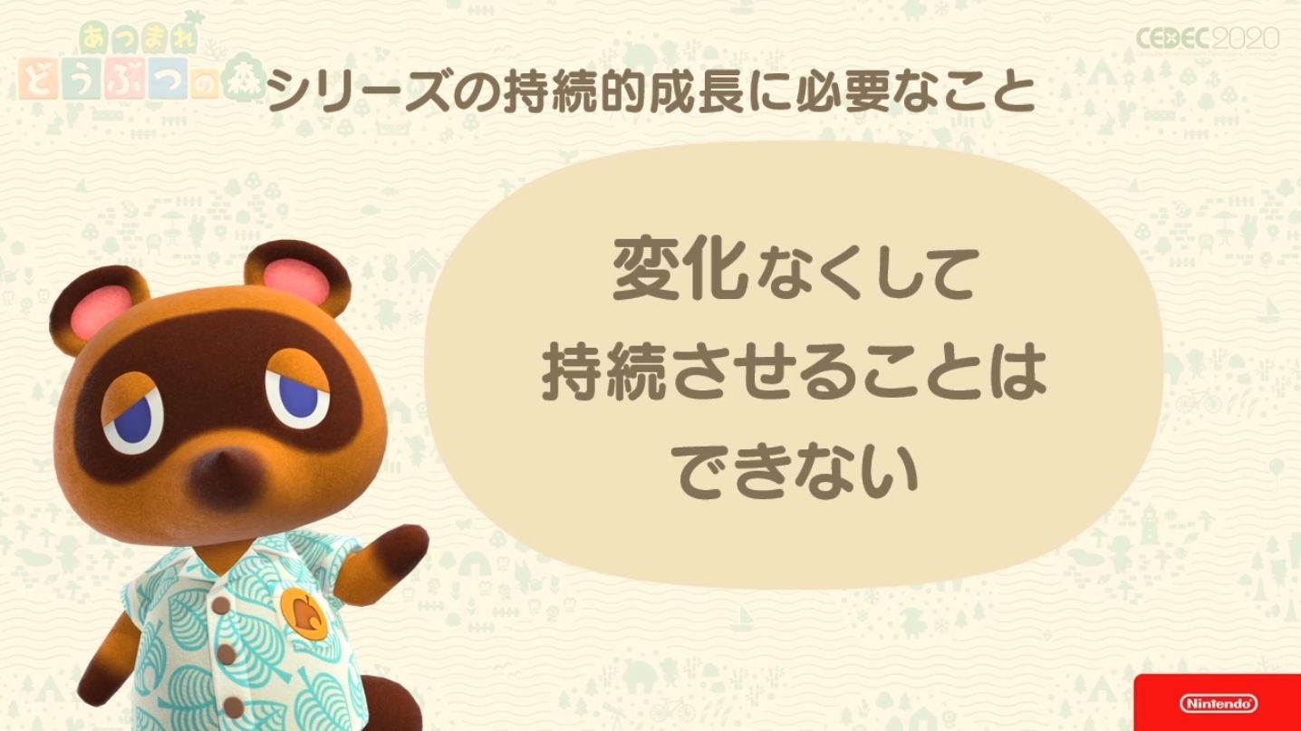 Il est dit ensuite que le thème abordé ici est sur le fait de garder une tradition tout en travaillant sur l’innovation, de continuer à grandir en surmontant des défis. C’est ce que l’équipe Animal Crossing a fait jusqu’à présent et qui se résume en une expression : « Rien ne se maintient sans changement ».