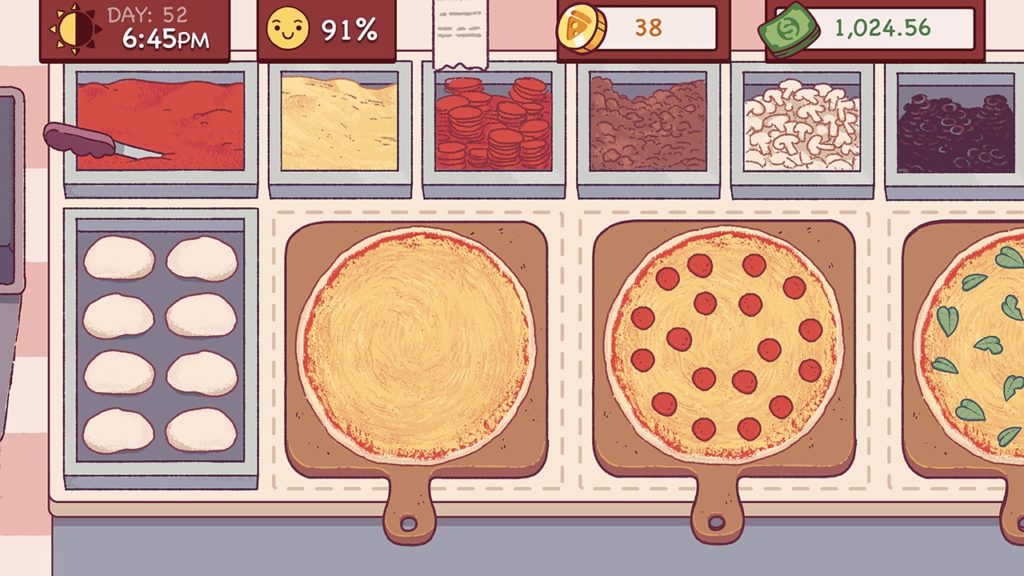 Rapidement plongé dans le vif du sujet, vous voilà à la tête d’une petite pizzeria qui débute. En guise de tutoriel, il vous faudra réaliser quelques pizzas (très) basiques, néanmoins parfaites pour faire ses premières mains sur le soft. La pâte à pizza à peine étalée (quasi automatiquement) sur le plan de travail, qu’il vous faut étaler la sauce tomate avec la cuillère, avant de badigeonner l’ensemble d’une couche généreuse de fromage râpé, et zou … ! Direction le four ! La voilà qui ressort enfin… Fichtre !! elle n’a pas l’air terrible… Le fromage n’est même pas fondu ! Le client semble pourtant satisfait… Il n’est pas difficile celui-là !