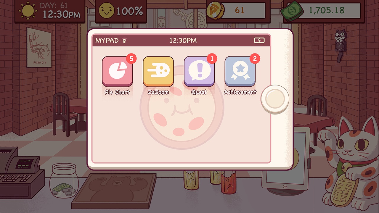 Enfin, l’arrivée de votre Mypad (une tablette) par la poste vous permettra aussi de répondre à un certain nombre de quêtes et de débloquer de multiples succès. Grâce à cette petite tablette et à votre travail acharné, les pépettes pourront commencer à s’accumuler dans votre besace et vous pourrez espérer améliorer sensiblement votre restaurant.