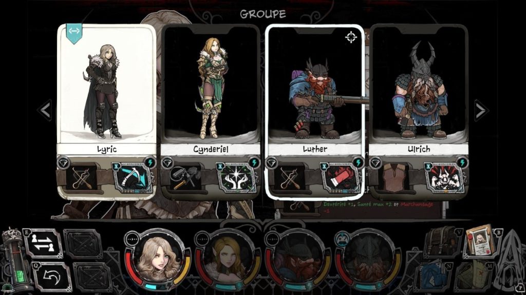 Comme pour la plupart des rogue-like, vous bénéficierez d’un point de respawn si votre personnage principal meurt au combat, ici ce sera la chambre d’Evélia dans laquelle vous pourrez stocker vos tenues et le surplus d’objets. Le reste du refuge se divise en différents quartiers dans lesquels vous pourrez trouver : hôpital, marché, pour vendre et acheter de l’équipement, panneau de recrutements et l’auberge. On notera que la vue du dessus dans cette sorte de ville souterraine n’est pas sans rappeler les anciens RPG, venant casser avec les phases d’exploration qui quant à elles sont en 2D. Le tableau des recrutements vous donnera accès aux fiches des héros et volontaires intrépides, vous laissant alors libre choix de monter votre patrouille pour partir à l’expédition. Une patrouille se compose de 3 héros plus Evélia Lyric, soit 4 au total.