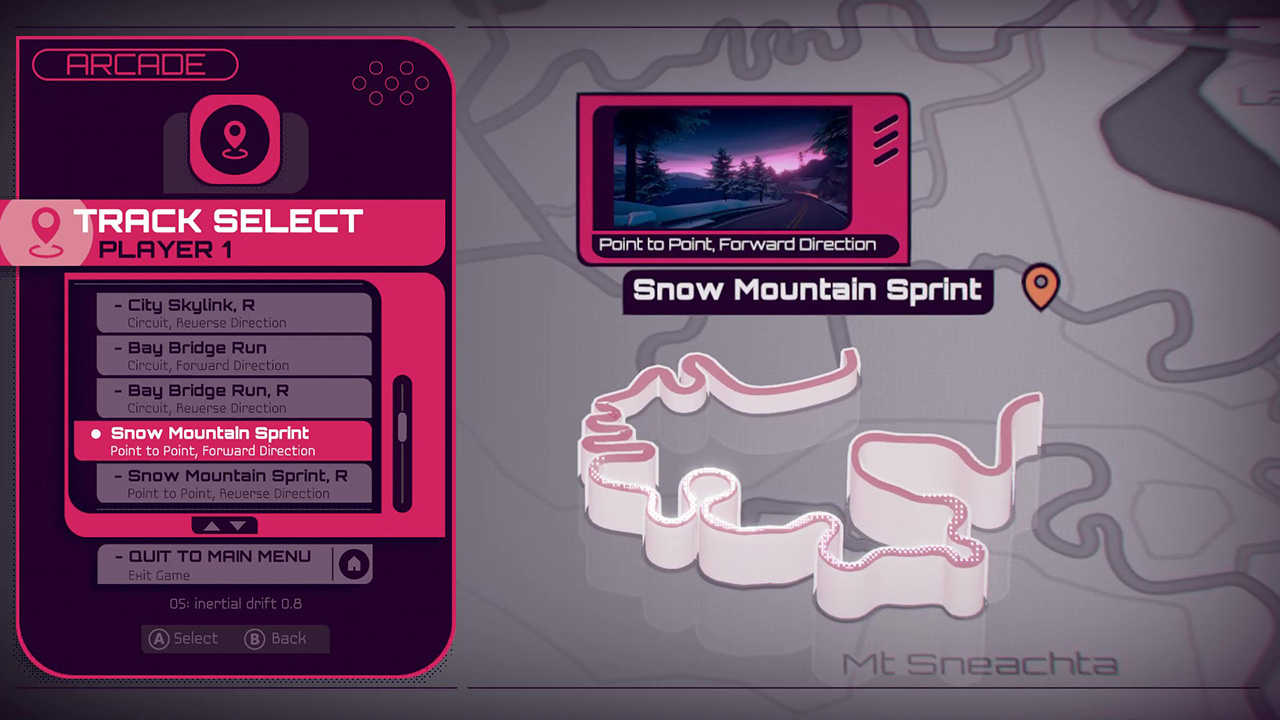 Intertial Drift est un jeu de course d’arcade, bénéficiant d’une ambiance « rétro-futuriste » aux couleurs façon néon, il a la particularité de proposer une maniabilité plutôt novatrice, notamment pour les « Drifts ». En effet, vous dirigez vos bolides avec les deux sticks de votre manette, un pour rester sur la route tout en vous dirigeant vers la gauche et la droite, le second pour doser vos Drifts, afin de bien tourner en gérant au mieux les virages les plus serrés… De prime abord, cela semble plutôt technique, mais au final, c’est relativement intuitif et suffisamment facile à prendre en main pour ne pas jeter la manette après le premier virage !