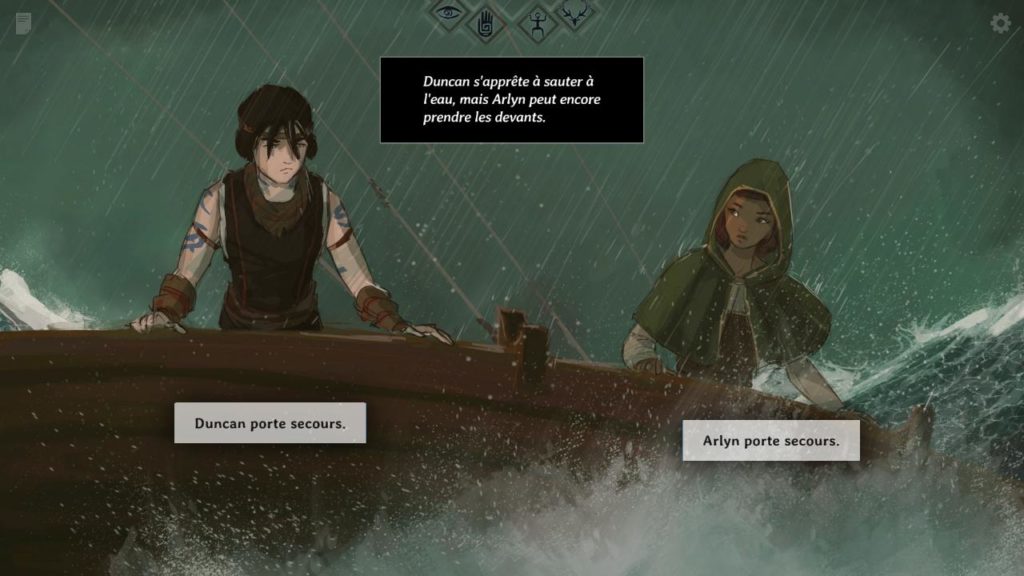 D’autant plus que le système d’alignement est encore plus abscons que dans Along The Edge. Dans Seers Isle, les alignements sont toujours au nombre de quatre, mais on a bien du mal à deviner à quoi ils correspondent : un œil, une main, un totem et un cerf. Leur signification s’éclaire avec le temps, mais elle reste tout de même trop obscure pour être anticipée lors des choix.