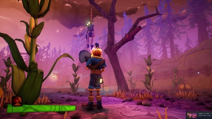 Ce qui saute rapidement aux yeux dès les premières minutes du jeu, c’est cette ambiance graphique et sonore envoûtante qui n’est pas sans rappeler l’univers de MediEvil avec une petite touche de Tim Burton, rendant l’atmosphère assez glauque malgré la palette de couleurs vives utilisées. La bande son, quant à elle, est simple mais diablement efficace avec une thématique halloween clairement assumée. Si l’univers et l’atmosphère sont excellents, et la patte graphique chaleureuse, rappelant les jeux PS2, le manque de luminosité peut parfois vite nous ennuyer. Le royaume est plongé dans les ténèbres suite aux attaques des monstres, donc on comprend vite que c’est un choix du développeur d’avoir mis si peu de luminosité, mais … pour le coup, il fait trop sombre ! Hormis les yeux de la lanterne de notre petite citrouille, il nous est difficile de nous repérer dans les granges, mines ou autres lieux obscures. Et les objets à ramasser vous feront tourner en bourrique ainsi que les ennemis vous attaquant depuis l’obscurité sans que vous ne puissiez voir plus que le bout de votre nez.