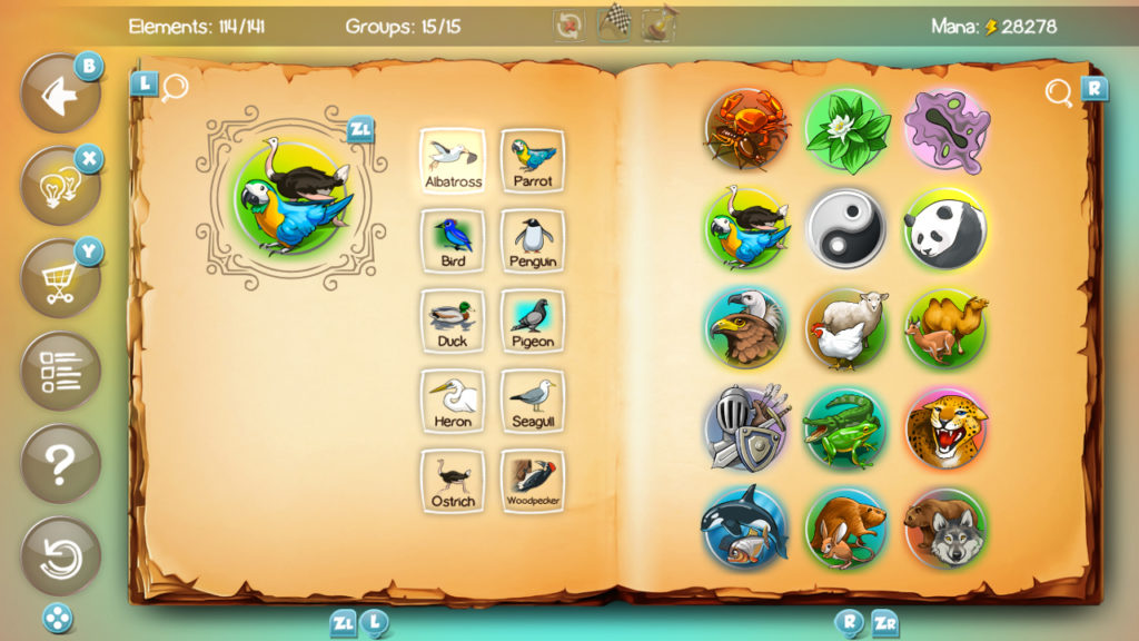 Ce pouvoir s’articule autour de petites pastilles regroupant tous les éléments d’un même thème. La pastille enflammée regroupe notamment le feu, mais aussi la lave (que vous venez de créer), le soleil, et bien d’autres surprises à découvrir. Votre tableau de bord (un livre ouvert) comporte une multitude de pastilles : la fusion s’effectue ainsi entre la pastille de la partie de gauche et celle de la partie droite. Le principe est particulièrement simple : faites simplement glisser un élément directement sur celui que vous souhaitez combiner. S’il ne se passe rien, la combinaison est incorrecte. Sinon, une petite animation suivie d’une petite anecdote viendra ponctuer la conception de ce nouvel élément. Si vous jouez en mode docké, il faudra sélectionner l’élément de droite au joystick droit, et inversement avec le côté gauche, avant de lancer la fusion. La jouabilité y est donc fortement altérée !