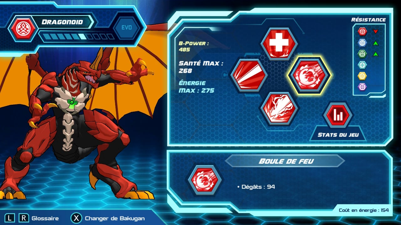 Votre équipe se compose de 3 Bakugans maximum. Ils ont tous des types et des compétences différentes qu’ils peuvent apprendre. Un combat de Bakugans ressemble à un combat de Pokemon avec des différences notables. Ici, pas de tour par tour. Les combats se déroulent comme dans la série d’animation : le « dresseur » doit récupérer de l’énergie et l’envoyer à sa créature pour qu’elle puisse réaliser une action parmi les 4 dont elle dispose. Chaque compétence nécessite une quantité bien définie d’énergie. Et vous imaginez bien que plus une compétence est puissante et plus, elle demande d’énergie. Vous allez donc vous retrouver à vous bagarrer avec le dresseur ennemi pour récupérer les baku-cores (doses d’énergie) avant lui. En plus de ce gameplay qui le différencie bien d’un Pokemon, vous pouvez, en plus d’améliorer votre Bakugan, améliorer le dresseur lui-même ! Pour obtenir les cellules d’énergie avant votre adversaire, vous pouvez vous acheter des baskets augmentant votre rapidité ou alors obtenir un objet qui le ralentit. Bref, un aspect stratégique qui peut s’avérer déterminant pour remporter vos combats.