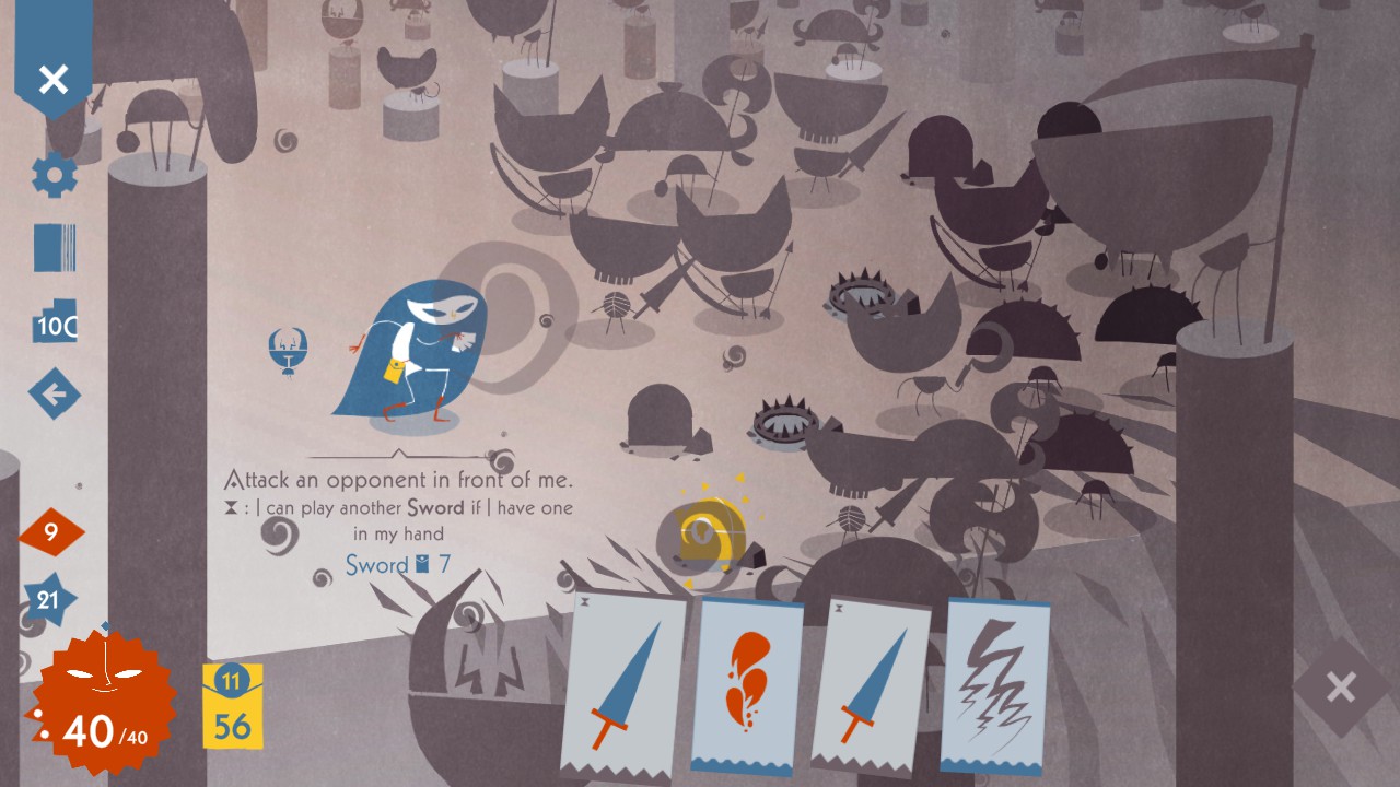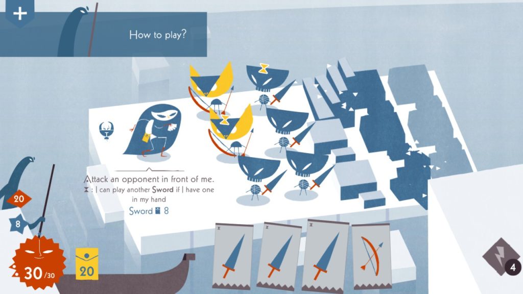 D’un seul coup, on dirige Iris et on l’aide à se battre à grand renfort de cartes. Ces cartes sont des armes pour commencer, des arcs et des flèches, des couteaux, des boucliers. Et quand les premières vagues d’ennemis sont vaincues, on aperçoit un escalier. Et on monte, et on sait qu’en montant, on va forcément se rapprocher du géant qui est assis tout en haut.