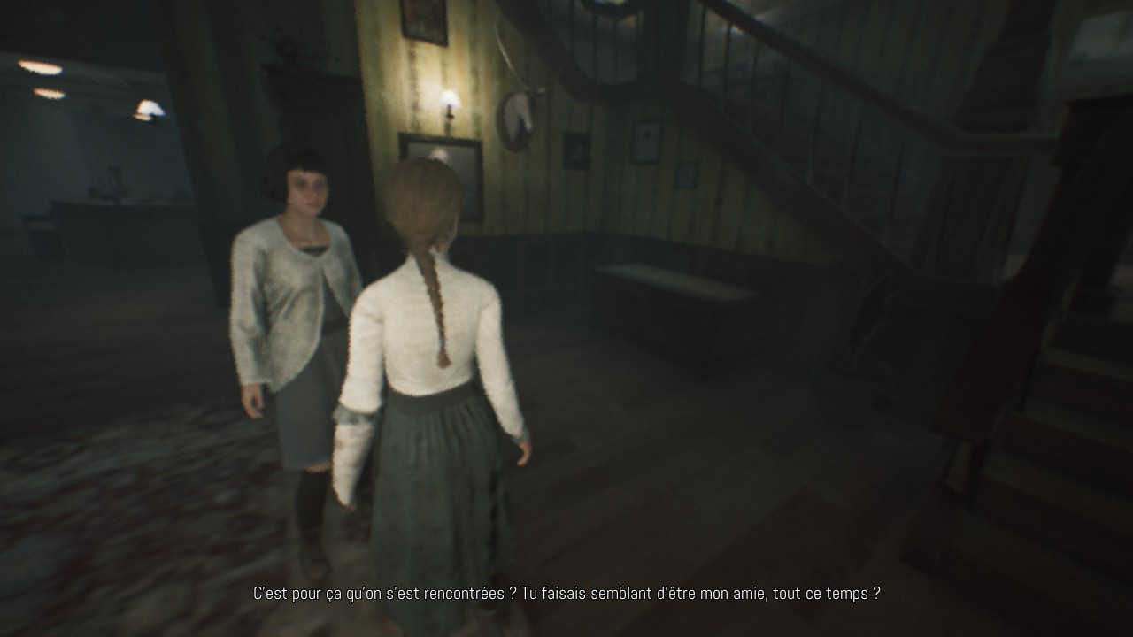 Parlons de l’aspect un peu plus visuel du titre qui fait…. Peur. Il y a un aliasing assez prononcé, couplé à un effet de flou qui pique un peu les yeux. Notons également une profondeur de champ peu élevée en fonction des lieux. Ça peut se « justifier » par le fait que le jeu se déroule en partie dans des zones sombres… mais on sait bien que ce n’est pas pour ça. Graphiquement c’est décevant, on est persuadé que la Switch peut quand même mieux faire ! Notons que le premier volet n’était déjà pas au top de ce point de vue là, mais qu’il avait bénéficié par la suite d’un patch pour améliorer le visuel… à voir s’il en sera de même pour cette suite (mais si c’est le cas, pourquoi ne pas l’avoir fait de suite ?!). Cet écart visuel est d’autant plus flagrant lors des cinématiques, qui malgré leur aspect granuleuses sont un chouille au-dessus visuellement. Par contre, point de vue sonore, l’ambiance est toute autre ! Les musiques sont toujours parfaitement dans l’ambiance. Inquiétantes lorsque l’on explore les lieux et stressantes lorsque l’on est poursuivi… Les voix des persos (en Anglais) sont vraiment convaincantes et les différents effets sonores (parquets qui craquent, corbeaux qui croassent…) donnent une atmosphère vraiment flippante au titre, on recommandera d’ailleurs l’utilisation d’un casque ! Le titre est entièrement sous-titré en français, par contre ils sont beaucoup trop petits pour être lisibles en mode portable (idem pour les documents à lire).