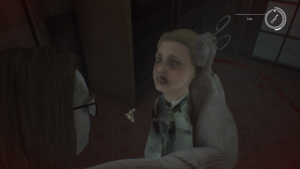 Dans le jeu les déplacements du personnage sont assez rigides. Même si des efforts ont été faits du point de vue vitesse de déplacement, il y a parfois de gros problèmes de collision, d’autant plus gênants lorsque l’on est poursuivi par un psychopathe. Exemple : Celui-ci vous file une mandale, vous avez un mur (ou un élément de mobilier juste derrière), déjà votre personnage sera systématiquement projeté vers l’arrière en lui tournant le dos et il y a une phase de latence durant laquelle vous serez coincé entre le mur (ou l’élément du décor) et votre poursuivant, ce qui vous empêchera systématiquement le moindre déplacement, permettant pendant ce temps au vilain de vous rouer de coups le temps de vous dégager… Un calvaire ! Certaines phases vous obligeront à vous débarrasser de vos poursuivants (en les assommant) et ne comptez pas sur un petit tutoriel pour vous expliquer comment faire… Vous trouverez quelques informations dans le menu de pause, mais rien de vraiment explicite… Après quelques recherches nous avons compris qu’il était possible de leur jeter des objets dessus, mais malheureusement pas tous. Et lorsque l’on est poursuivi, cela complique grandement la tâche. Vous pouvez porter simultanément un élément de défense « offensif » (couteau, ciseau…) et trois éléments défensifs/de diversion (tasse de thé, bouteille de vin, boite à musique, poupée sonore…). Le problème, c’est qu’il n’est pas possible de jeter une boite à musique (on peut seulement la poser au sol pour distraire un ennemi,), du coup il faudra changer d’item via une pression sur le bouton X, puis une fois sur R, puis sélectionner un objet jetable en pressant sur A, puis presser à nouveau sur X pour fermer le menu. L’inconvénient c’est que c’est en temps réel et que pendant que vous faites ces actions, vous ne faites rien d’autre, laissant libre cours à l’ennemi de vous tabasser. Idem si vous êtes en train de courir pour semer votre poursuivant, le fait de presser sur X vous stoppera dans votre course et bien entendu, il n’est pas possible d’accéder à ce menu quand on est planqué dans une armoire ! Quant aux éléments de défense « offensifs), ils ne sont utilisables que durant des QTE qui ne se déclenchent pas systématiquement. Il faudra donc soigneusement préparer ses « munitions » avant d’aller affronter des méchants. Les phases en mode papillon ne sont pas beaucoup mieux et encore une fois, aucun tutoriel pour vous expliquer comment faire avancer voter lépidoptère. On a l’impression que celui-ci est bourré et c’est la cata encore avec la gestion des collisions, parfois le simple fait de vouloir passer une porte-relève de l’exploit… Si vous survivez jusque-là, sachez que le jeu propose des points de reprise avant chaque « objectif », il est également possible de sauvegarder et de régénérer sa vie en utilisant des miroirs (comme dans le premier volet). On peut également améliorer les différentes capacités de son personnage (Vie, Efficacité dans les défenses, vitesse, durée du mode « papillon », dextérité dans la création…). Il est également possible « d’améliorer » des objets de défense ou de diversion en les combinant avec d’autres objets, comme des fils de fer, de l’ammoniaque, des détergents …