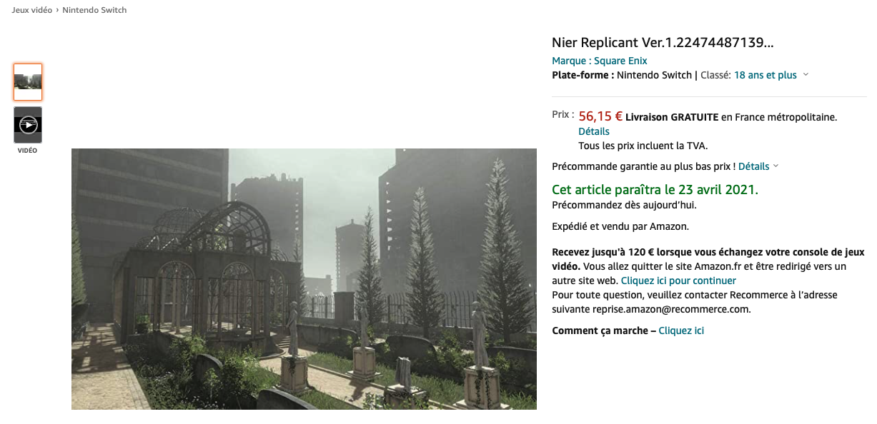 Amazon France vient-il de faire une boulette ou une énième erreur ? Difficile à dire mais aujourd’hui on découvre le listing de Nier Replicant sur Nintendo Switch, le premier opus remasterisé à l’occasion du 10 ème anniversaire de la saga. Nier Replicant Ver.1.22474487139.. (signifiant la racine carrée de 1.5) est prévu sur PC, PS4 et One en avril 2021. Ici, la date du 23 avril 2021 est affichée et il est possible pré-commander le jeu.
